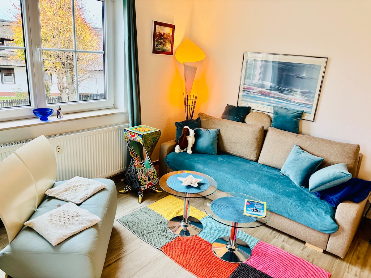 Die helle, freundliche Ferienwohnung mit Wohn/schlafzimmer und Kinderzimmer, Küche und Badezimmer befindet sich separat in einem historischen, schilfgedeckten Bauernhaus direkt am Bodden mit Blick auf die Schoritzer Wiek. Sie befindet sich in der ersten Etage, ist gemütlich und einfach ausgestattet. Bemerkenswert ist die Schönheit und Ruhe meines Wohnortes. Ich bin als Gastgeberin vor Ort und habe hier meine Kunstwerkstatt. Hinter dem Haus gibt es einen Garten.