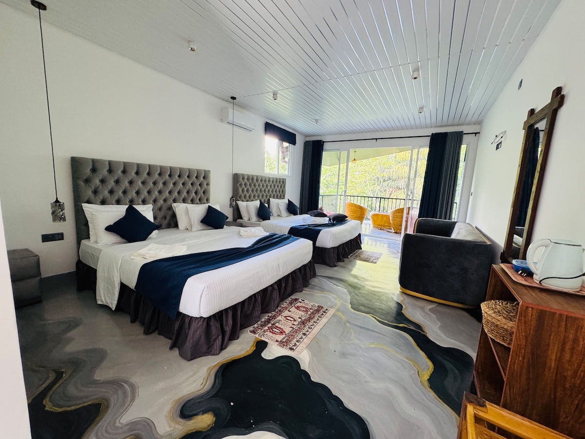 Welcoming to Ella panorama villa.A beautiful and Spacious Room waiting for you! . The family room offers 2 extra large bed, Fully temperd glass doors, air conditioning,Refrigerator, Electric Kettle and Tea and coffee amenities,a private entrance, a wooden terrace with panoramic mountain view as well as a private bathroom featuring a shower. And also 10min Walking distance to the nine arch bridge. We provide Free parking and High speed Wifi facilities.