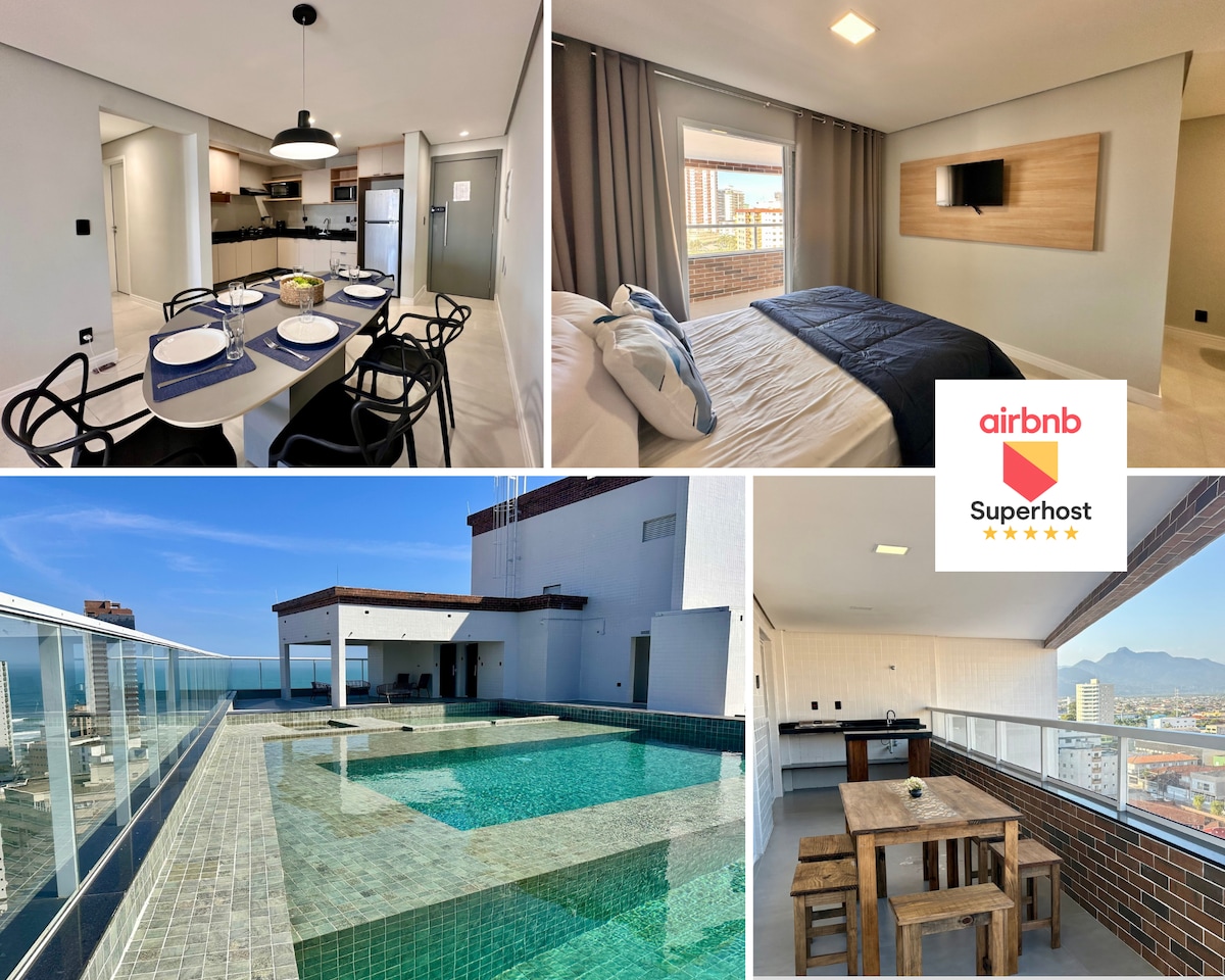 LIMPEZA,CONFORTO E EXCELENTE LOCALIZAÇÃO FAZEM SENTIDO PRA VOCÊ? Se sim, seja muito bem vindo a um dos melhores AIRBNB da Praia Grande, projetado com muito bom gosto, venha se surpreender ! FRENTE MAR! AR CONDICIONADO! O mais completo e acolhedor do Caiçara, prédio recém entregue, completo em eletros, smart TV 55 pol wi fi ,bancada pra home office. Churrasqueira na sacada com linda vista do mar pra relaxar, garagem coberta ,tela nas janelas portaria 24 hs ,planejado pra uma experiência única.