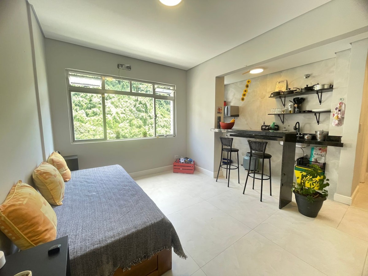 Apartamento Studio. Cozinha, quarto e banheiro. Condomínio de frente para praia, basta atravessar a rua. Banheiro e ducha adicionais no térreo para banhistas. Estacionamento com segurança 24h. Mercado até 22h do outro lado da rua. Próximo ao centro turístico, feirinha, pista de skate e Praça Dudu Samba. Próximo também de padaria, farmácia, banco, pizzarias e restaurantes. 2km do pronto-socorro Central. Entrando no acesso da avenida, não precisa subir escada. Não há janela de vizinhos na frente