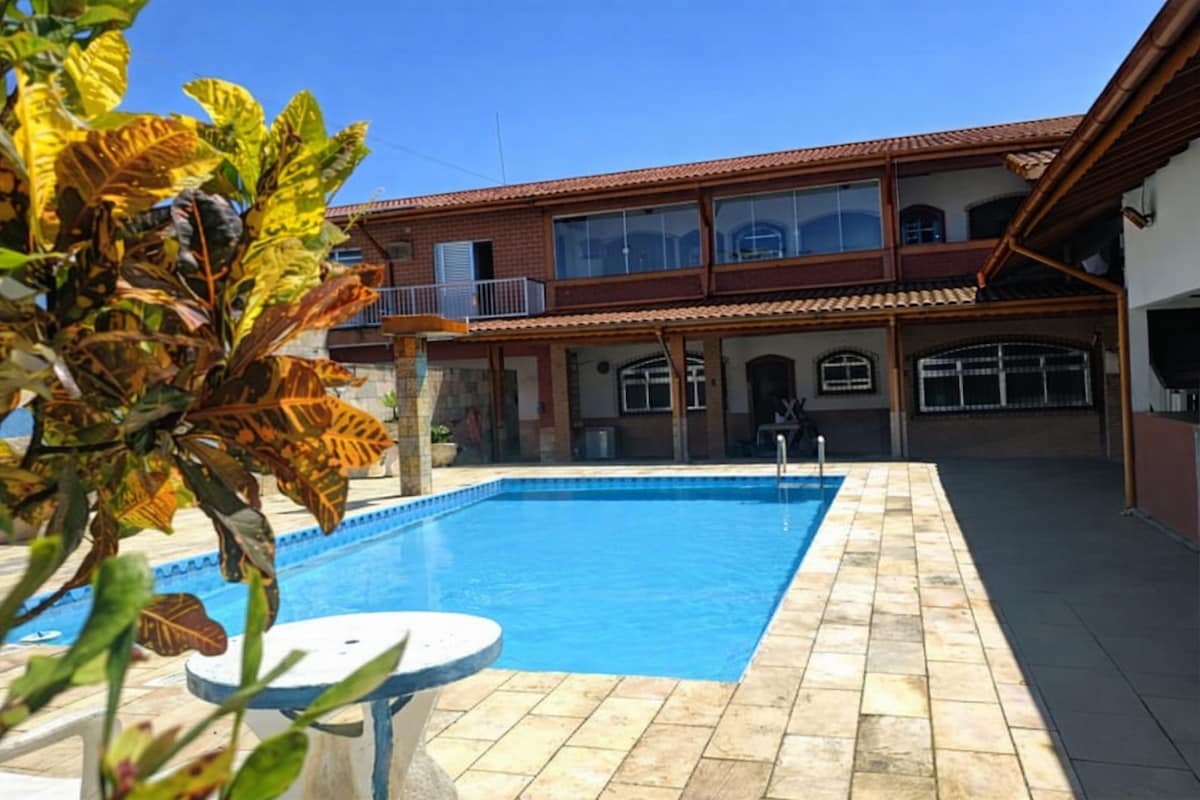 Linda Casa em Mongaguá, a 90 metros da praia. Excelente espaço externo com piscina, churrasqueira/forno e fogão a lenha para fazer aquele churrasco ou aquela comida com muita diversão na beira da piscina. Sala de estar com Mesa de sinuca e tampão de ping pong. Internet WI-FI NETFLIX Sistema de alarme Total de 3 quartos (sendo 4 camas de solteiro e 2 de casal, com mais 7 colchoes a parte). Casa conta com 3 banheiros no total. Casa terreá, excelente para pessoa com mobilidade reduzida.