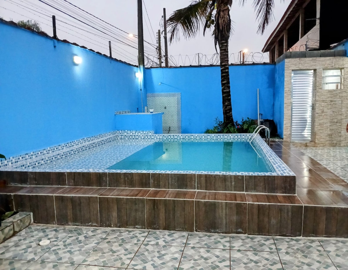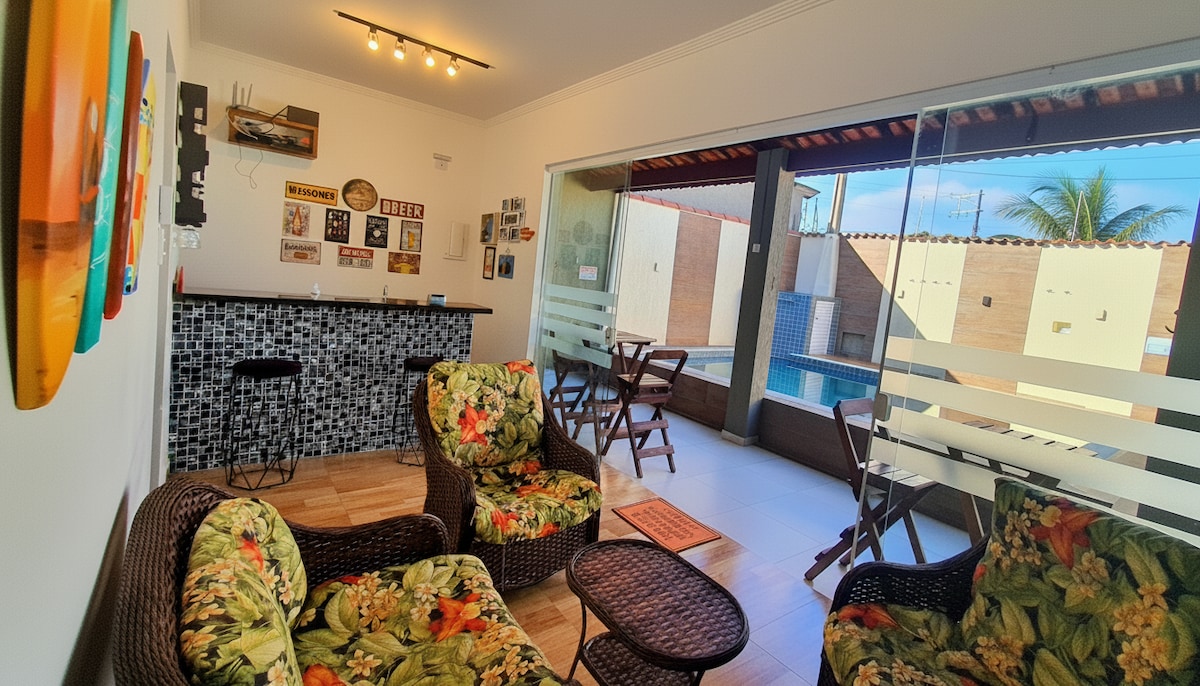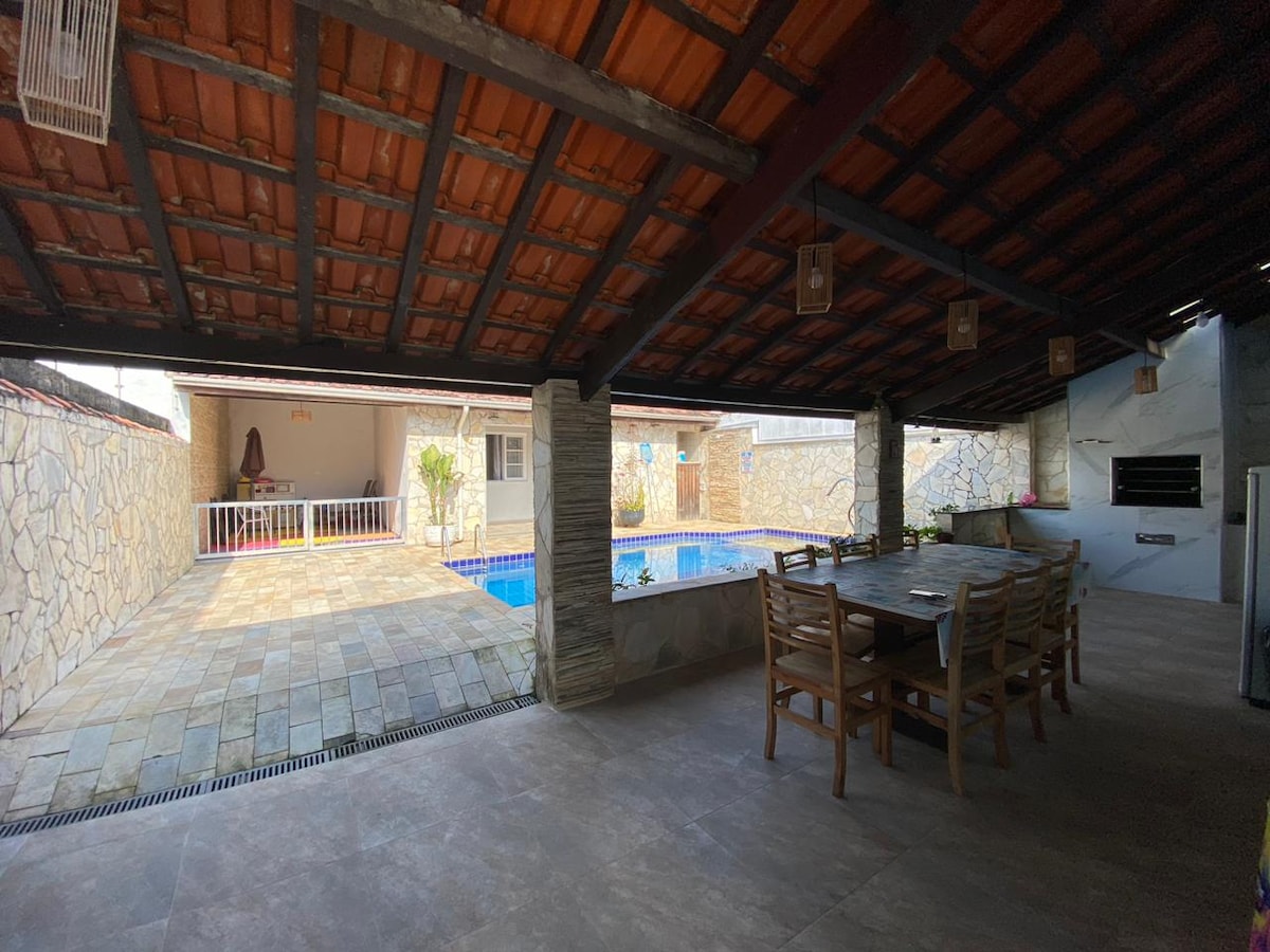 Casa aconchegante com bastante espaço aberto para tomar sol,curtir a piscina e um bom churrasco em família com amplo espaço coberto, apenas 340 metros da praia
