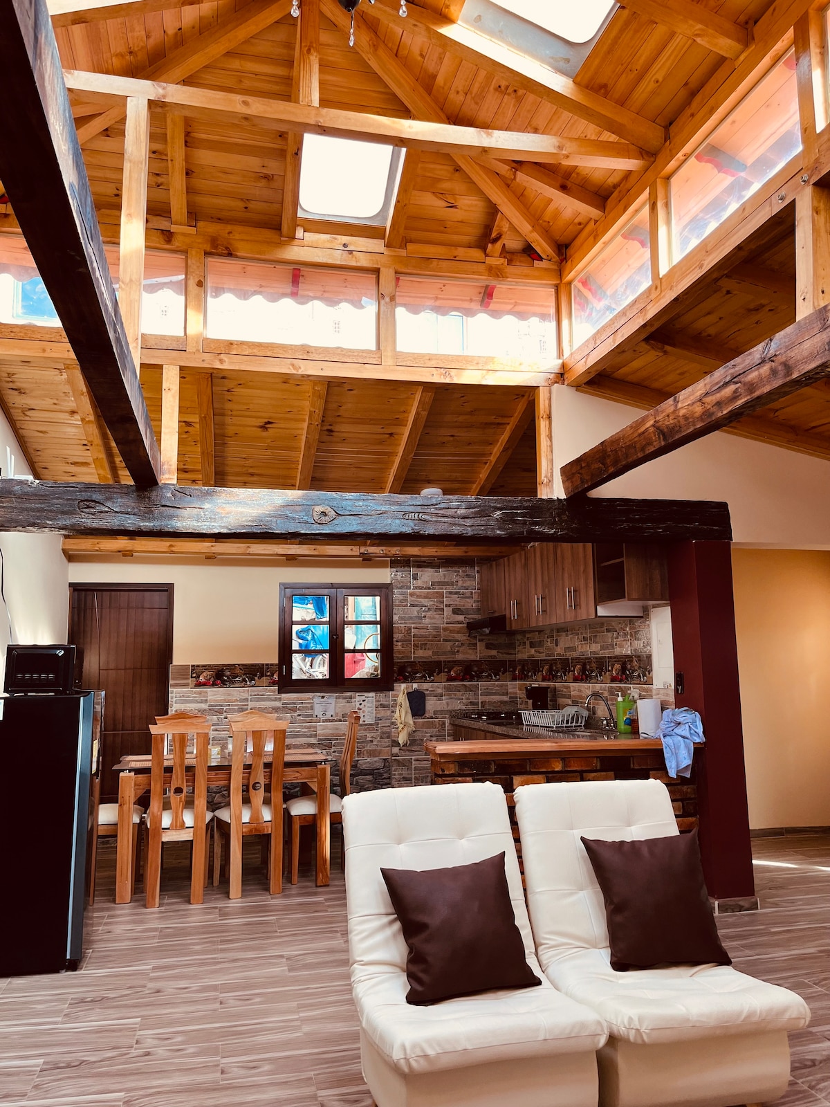 Descansa y déjate atender en esta acogedora cabaña loft (120 m2). Cocina full equipada, acabados de lujo y enormes ventanales donde tendrás un palco hacia la imponente Laguna de Tota! Todo este precioso lote es para ti! Delante, la laguna y las montañas. Detrás, un bosque, reserva natural. Leidys te ayudará en lo que necesites! Pídele un rico plan fogata o chimenea (incluidos). Si quieres desayuno, almuerzo o comida, traído hasta la puerta a un buen precio, también es posible! Trae tu mascota!