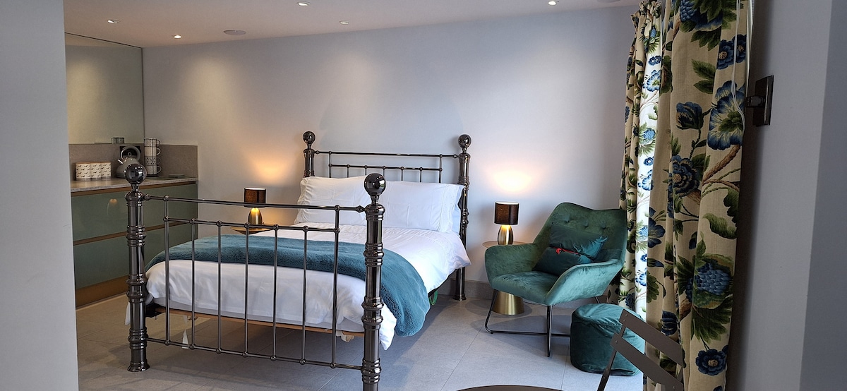 Newly built beautiful self-contained unit situated on the first floor of a detached building within the boundary of a family home. Large living/sleeping area including a luxurious king size bed; seating area and tea & coffee making facilities. Recently installed kitchen area with fridge: oven & microwave. Large smart TV.Additional day bed makes the suite perfect for families. Separate bathroom with electric shower. Private outside seating area overlooking the beautiful Monmouthshire countryside