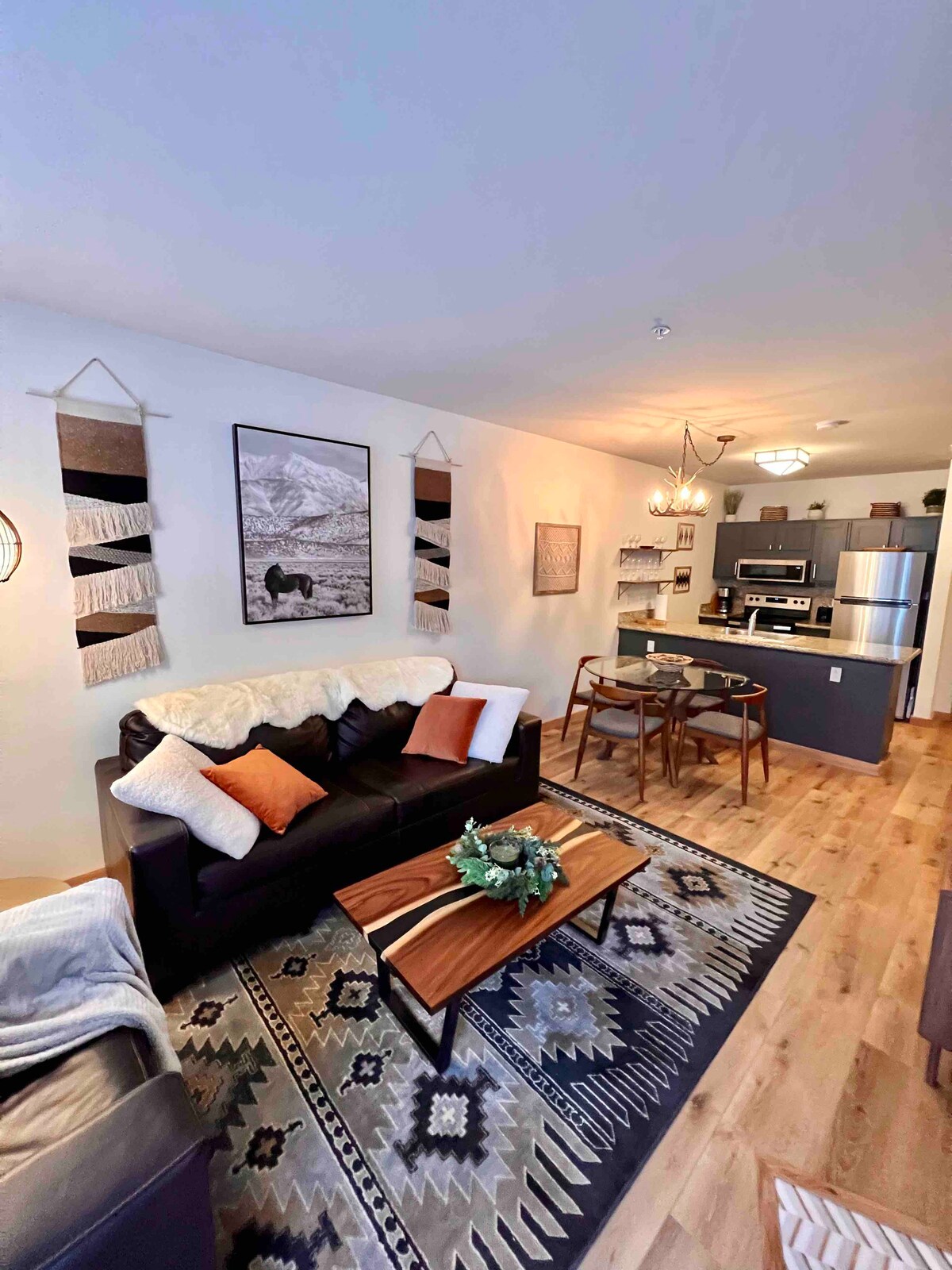 Very unique, cool, shabby chic farmhouse style condo. Pristine and recently remodeled throughout. Located on the main floor across from the pool (closes in fall) & hot tub and direct parking for 1 car only in front. It has a pvt. balcony and is centrally located within a block of the free shuttle that takes you to the mountain. There is 1 queen bed and a queen size pull out for up to 4 guests. The unit is walking distance to grocery stores, bars and restaurants. Sorry no pets allowed by the HOA.
