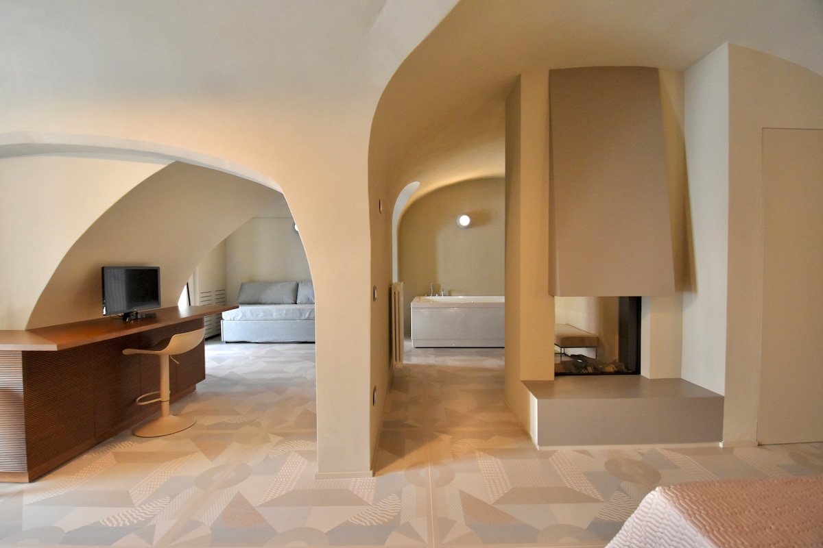 Una suite nel cuore del centro storico con le volte a botte e pavimento d’epoca. Finemente ristrutturata nel rispetto della sua essenza, senza trascurare i comfort per rendere unico il vostro soggiorno. Uno splendido terrazzo con vasca idromassaggio è pronto ad ospitare aperitivi e cene, in una location suggestiva ed intima. Le scale che conducono alla Suite e poi al terrazzo sono quelle tipiche del centro storico! Un po’ ripide alla vista, ma dotate di idonea illuminazione e doppio passamano!