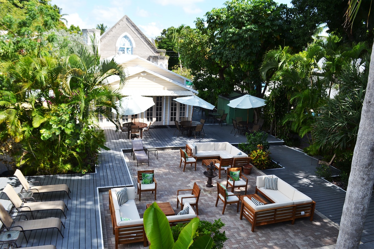 One of 6 rooms at Andrews Inn! Neighbor with the Hemingway House, a beautifully decorated room with private bathroom, air conditioning, ceiling and tower fan, a new queen-size NECTAR mattress, Smart TV with Netflix, free Wi-Fi, in-room refrigerator. Guests staying here must be able to climb a single flight of stairs. We are an owner-operated Guest House where you will feel a lovely welcoming and a relaxing atmosphere. Included in the price: breakfast, happy hour, bicycles.