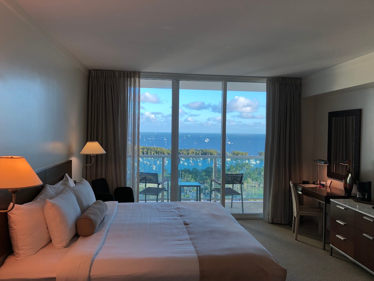 King studio with private balcony, in the heart of Coconut Grove overlooking sailboats and Biscayne Bay. "It’s the greatest view in all of Miami.” WiFi, 42" TV, king bed, desk, sleeper sofa, kitchenette, 1 parking, hotel amenities Walk to cafes, shops, movie theater, and parks. Just minutes from downtown Miami, South Beach, Port of Miami, and universities .... enjoy Miami from the original art community by the waters of Biscayne Bay - a favorite of writers, artists, musicians, and mariners.