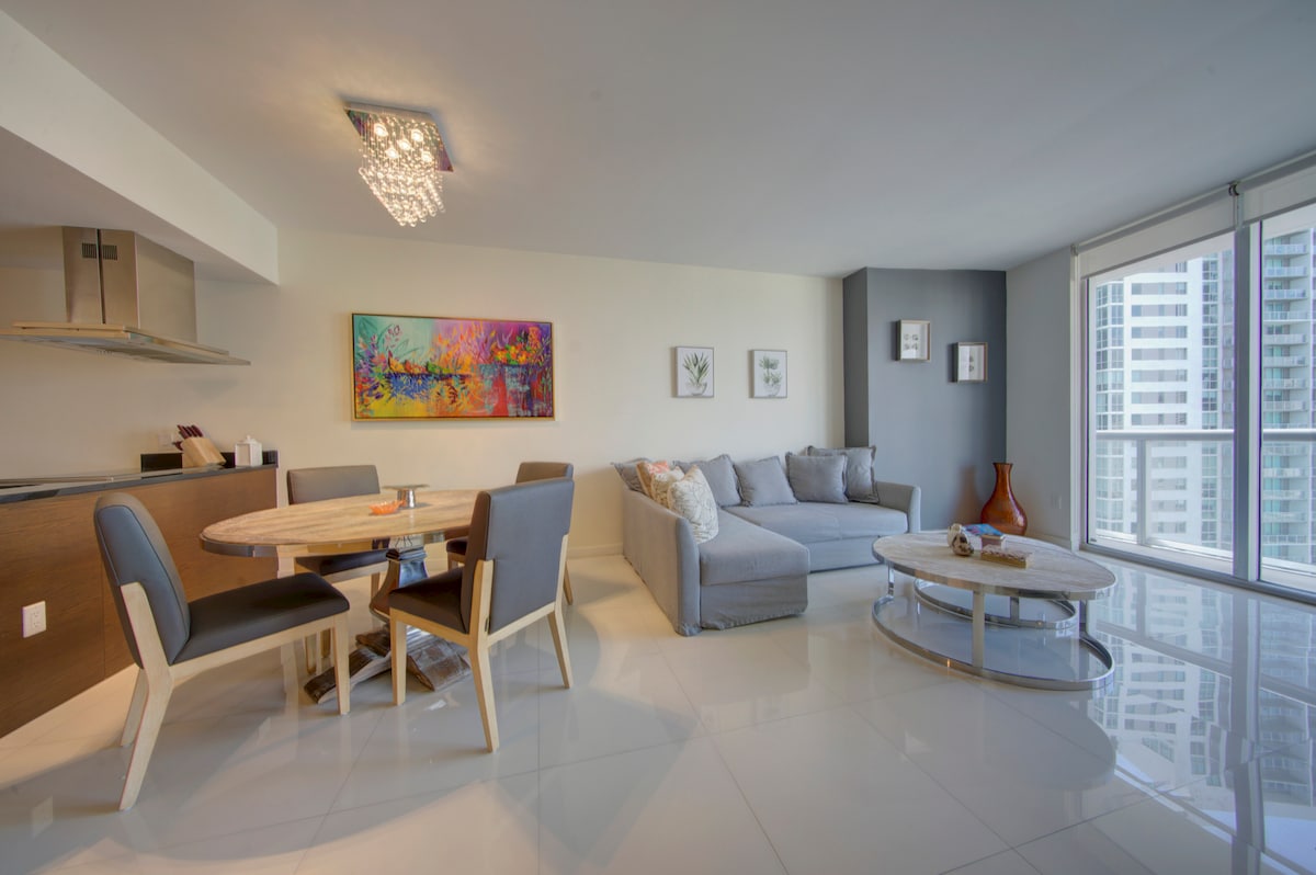 This Unique and Luxury 5 Stars Condo, Fully Equipped, located in the same building as the famous W Hotel, Icon Brickell, with the biggest SWIMMING POOL in town. Amenity card will be provided by the building, 2 per 1-bedroom. We are located on the mouth of the Miami River on the sea, with amazing views of the sunrise in the morning and sunsets in the dusk. Steps from City Centre Mall, downtown, restaurants, and nightclubs. Six miles from Design District and South Beach. THIS IS THE PLACE TO STAY!