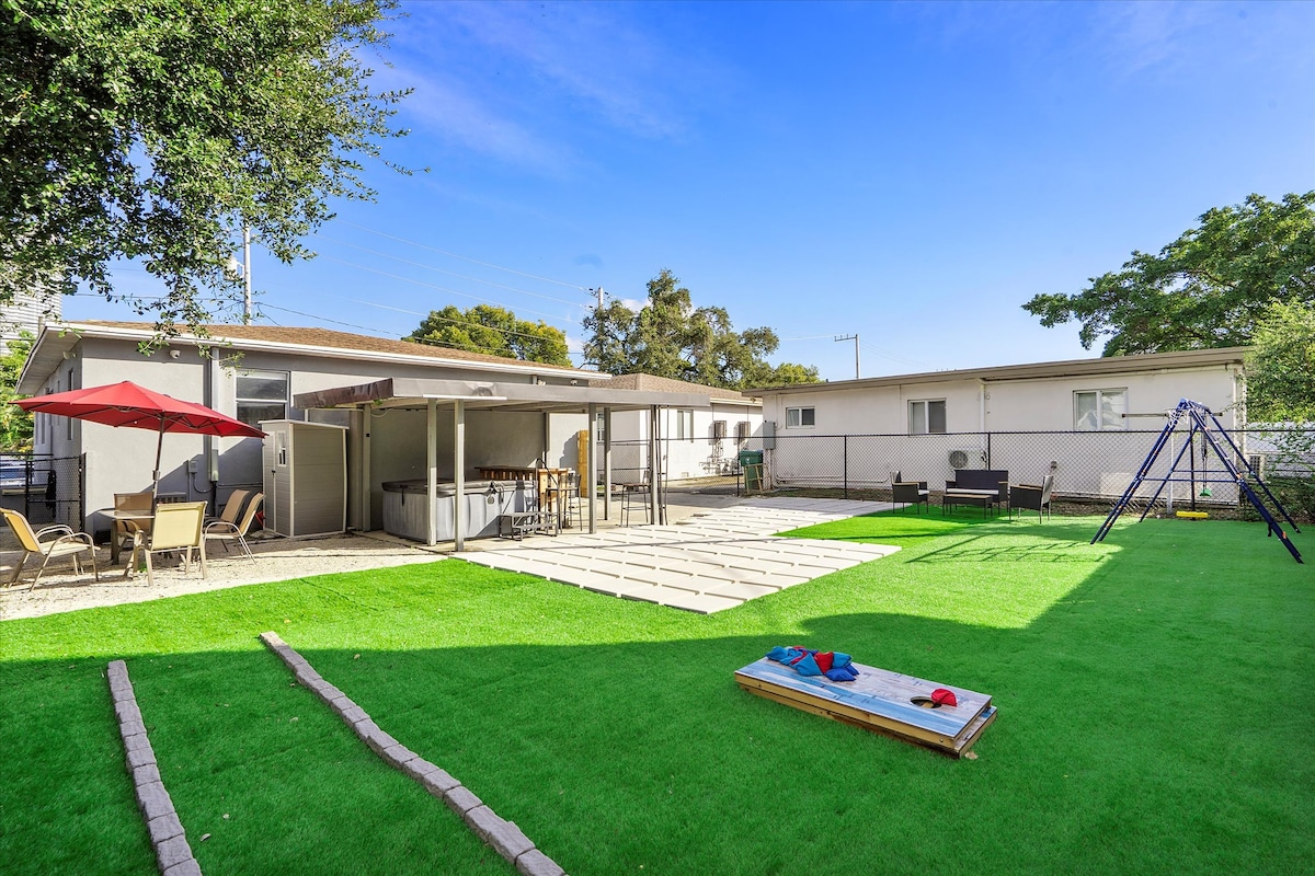 Mimosa Manor is a stunning newly renovated 4bedroom, 3bath home. Upstairs great room w/ vaulted celling's & plenty ofnatural lighting. The kitchen is a chefs dream. The master BDRM is equipped with an adjustable bed & spacious in suite bathroom. The downstairs, its own private living area w/2 bedrooms, bathroom & kitchenette and its own entrance. The home is equipped w WIFI & TVs in every room. The backyard has an 8-person hot tub, tiki hut and table for six. Cabana Club access included.
