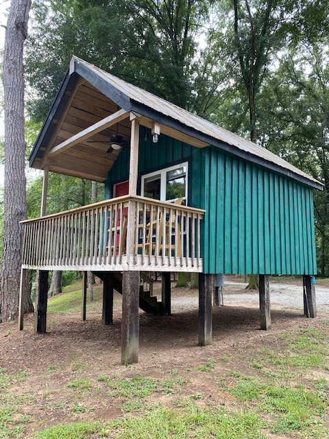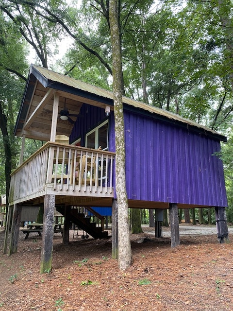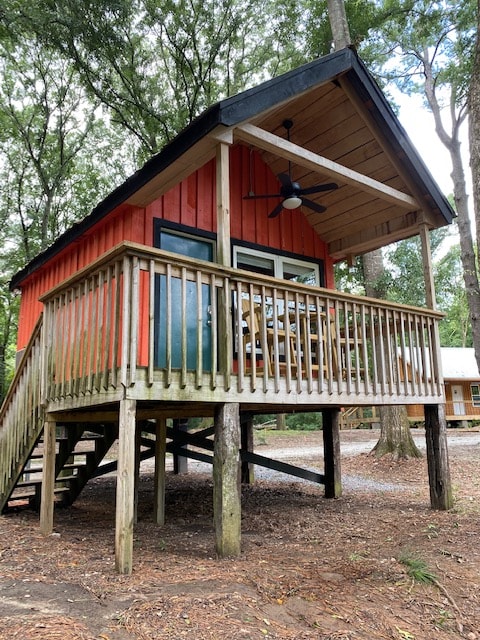Welcome to our beautiful timber frame treehouse! Hand-built by local carpenter David Green, this work of art overlooks the Ocmulgee River. Our two-story dwelling has two porches, a lofted bedroom (full bed), a living area (window seat/bar/twin bed) and kitchen area (foot-powered cast iron sink, outdoor camp stove, prep area, dishes, cookware, and more). As it sits currently (Spring 2026) there is not an indoor restroom. We do have a camping style toilet (Luggable Loo) available.