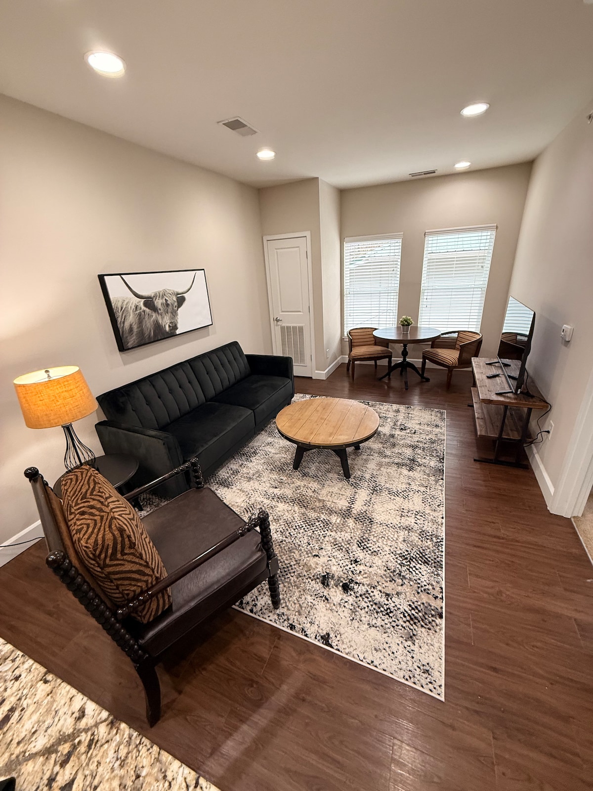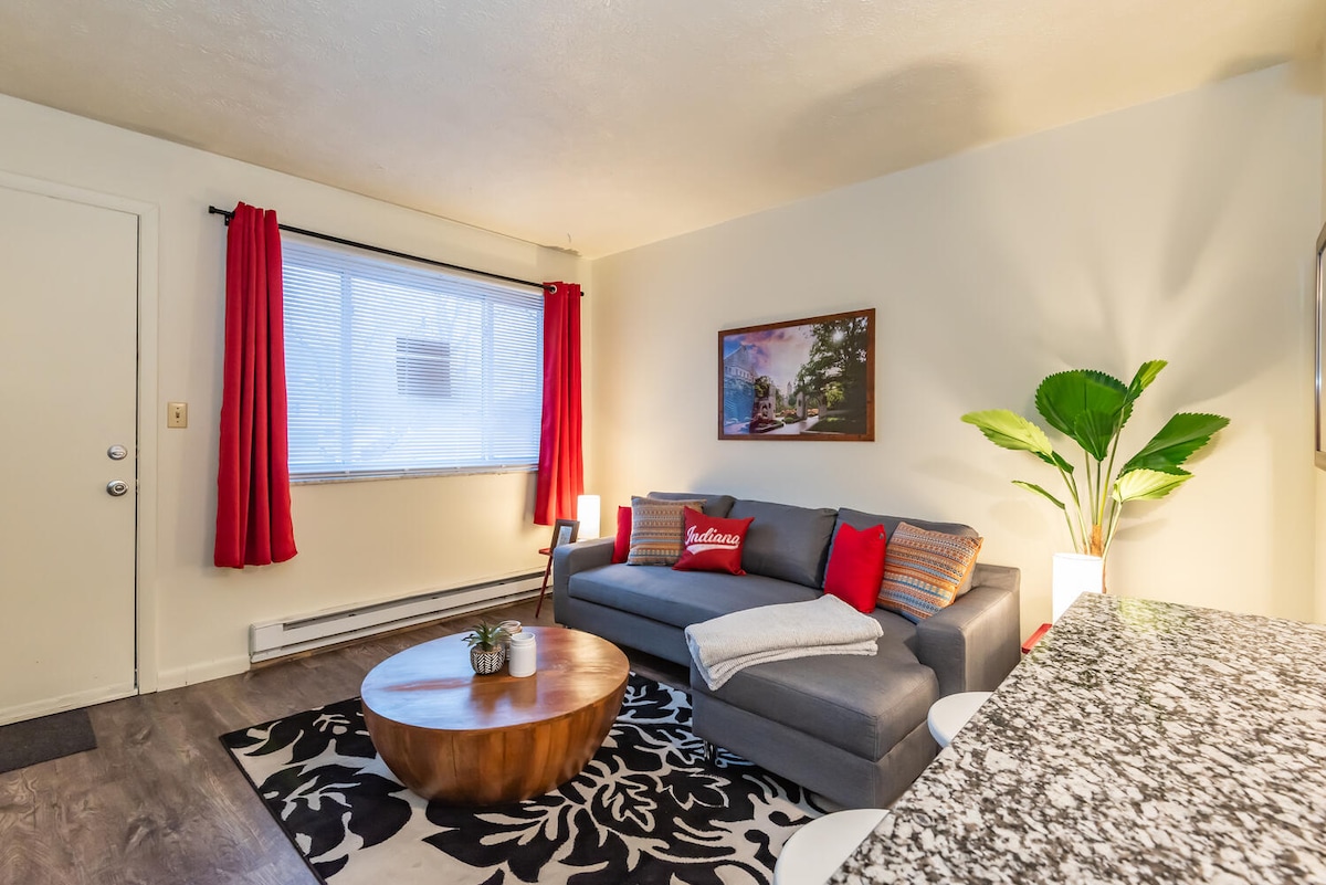 We are conveniently located within walking distance of Downtown, Bryan Park, and The B-Line Trail, 1 mile to IU Campus, 1.8 miles to Assembly Hall, and 3.5 miles to IU Hospital. Our beloved luxury apartment is one of the nicest places to stay in town. It underwent a ground-up bespoke renovation with white oak hardwood floors, quartz countertops and premium appliances, rivaling a premium suite at a boutique hotel with the added privacy, charm, and amenities of a home for a great price.