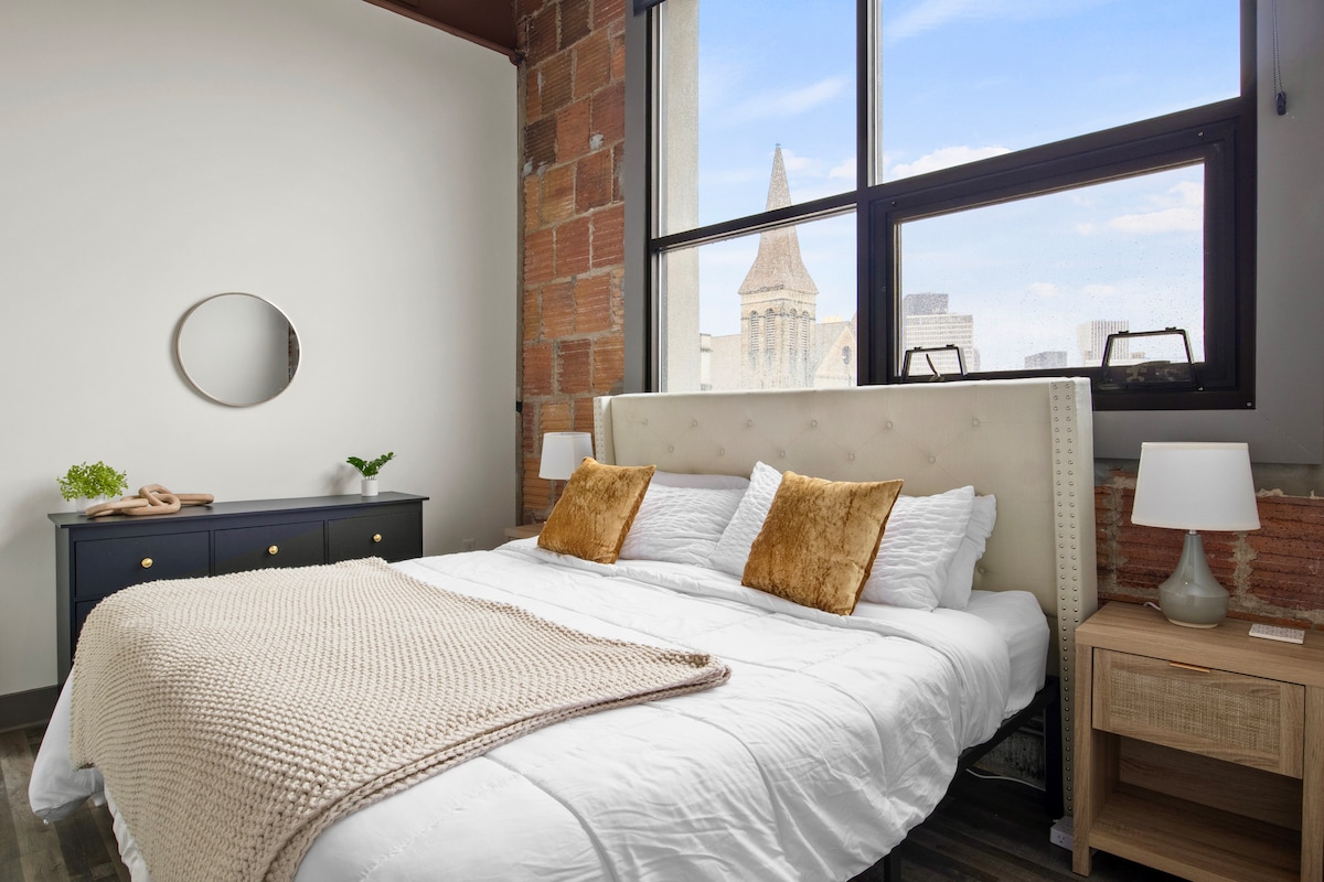 Stay in the historic Center City Place to experience the best food, business and entertainment in center city. With 1800 square feet, luxury finishes & appliances, this loft is the pinnacle of perfection. Here at Lofted Living, we provide a seamless experience for you, including a dead simple check-in process and periodic check-ins during your stay. With 24/7 availability we will assist you with anything from restaurant suggestions to providing additional towels. Sit back and enjoy your stay!