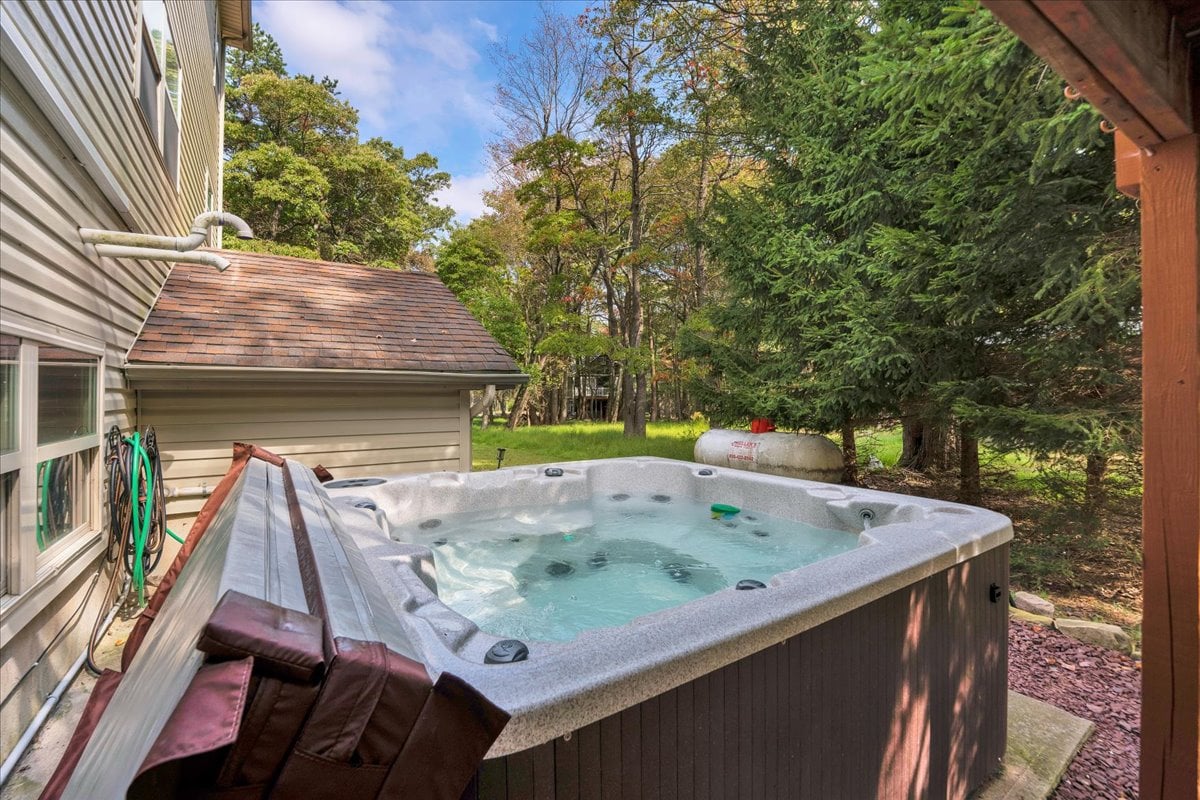 Relax and unwind at this stunning Poconos vacation property. Melt your troubles away with a dip in the hot tub or experience our custom-built Finnish-style sauna. This property has been thoughtfully remodeled throughout with warm wood floors, hand crafted ceramic tiles, extra comfortable beds, and custom artistic details, creating a truly unique and luxurious feel. Relax in the spa-like bathroom, sit by the firepit, or enjoy the lakes, pools, tennis courts or other amenities in the community.
