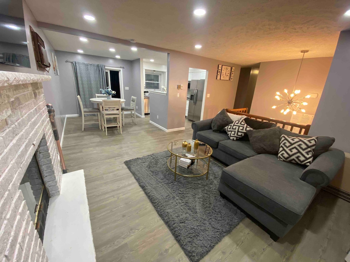 Fast-WiFi, dog-friendly home with free parking, offering 3 bedrooms and 1 bath inside a secure, gated community in the Pocono Mountains. The house combines rustic charm with modern comfort, featuring cozy fireplaces, large windows, and a spacious deck perfect for enjoying the surrounding nature. The location is close to top attractions including Camelback Ski Resort, Kalahari, Great Wolf Lodge, and Pocono Raceway, making it an ideal getaway for all seasons.