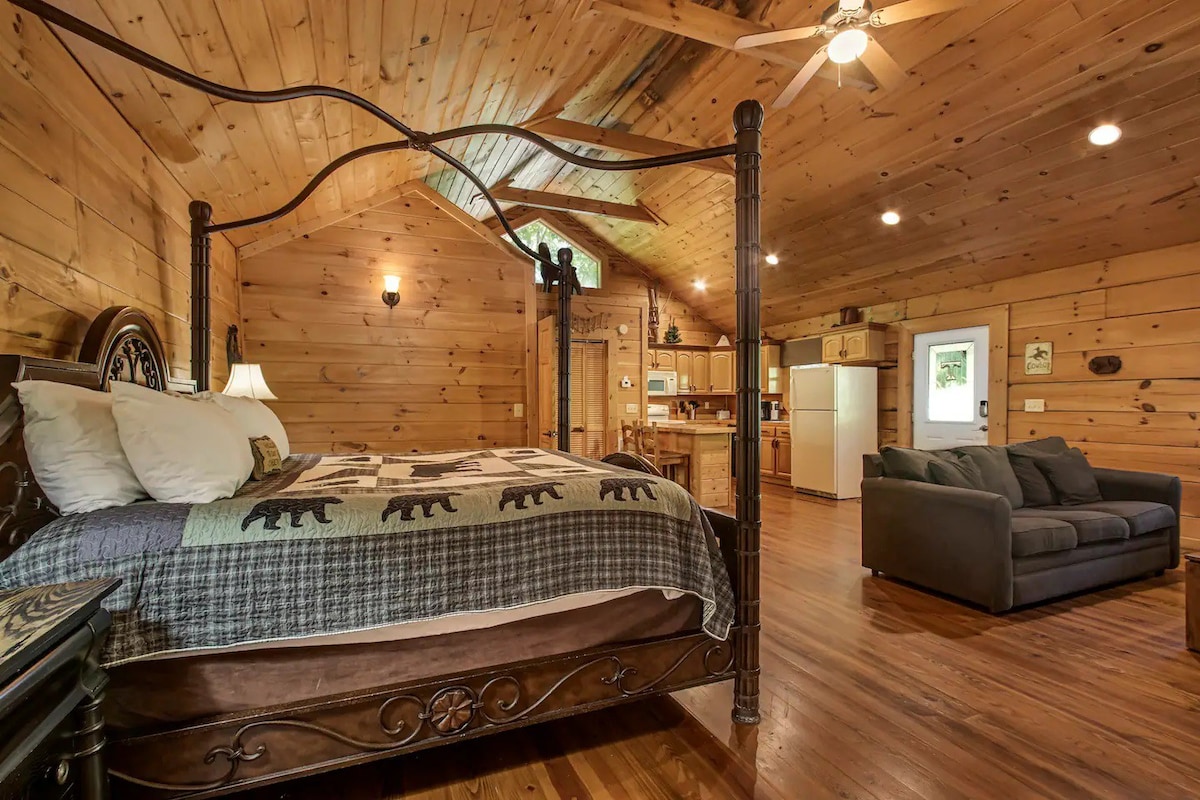 This modern log cabin is a large studio with all of the 'bells and whistles' !!! There is a very important looking king size bed, gorgeous mountain decor, fold out sofa, Adirondack chairs for the porch and old-fashioned porch swing. Full kitchen, one bath, 65" Smart TV with Fast WiFi. Tucked into the woods with a BIG hot tub, this is perfect place to celebrate or honeymoon. Come with friends. Or be selfish and bring her just to be together. Well, you could bring the pup too.