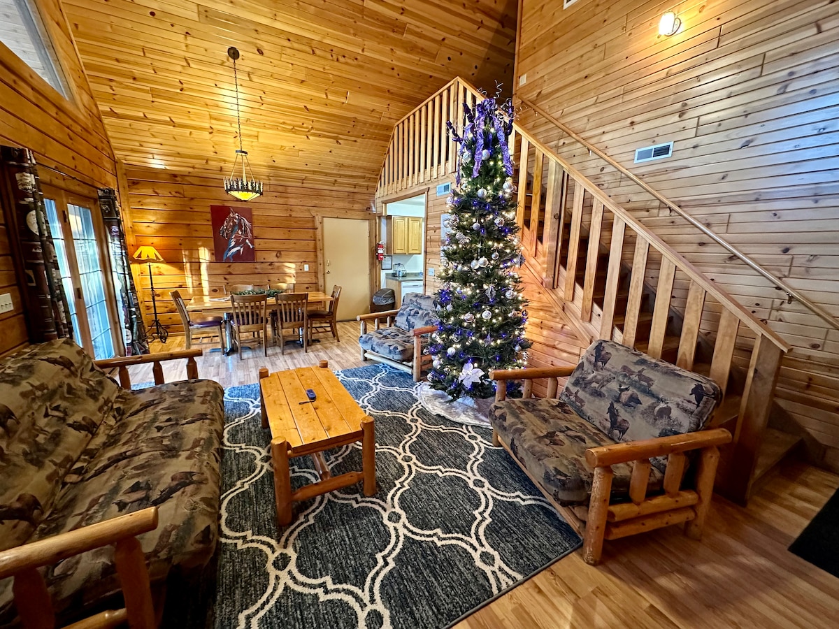 Our cabin is located next the Jellystone Yogi bear campground and Three Bears Lodge. Plenty of parking for ATV’S and trailers in the grass. New furniture in living room. 65 inch TV with Superbox. 2 private bedrooms with queen beds, on main floor. TVs in both rooms/w Ruko 5 twin beds and bathroom upstairs in the loft. 40 inch TV w/Ruko , DVD player Fully stocked kitchen. Washer/dryer. Grill for outdoor cooking. The villa next door may also be available if you have a group larger than 10 .