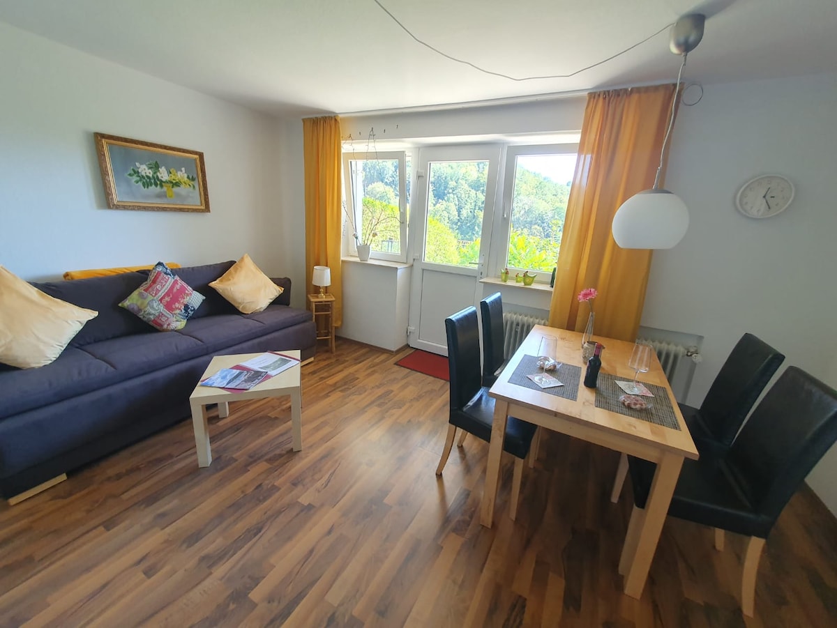 Entspannt euch in unserer besonderen und ruhigen Unterkunft! Das neu eingerichtete Apartment für bis zu 4 Personen mit ca. 60 qm verteilt sich auf zwei Etagen. Hervorzuheben sind eine vollausgestattete Küche, TV, Schlafcouch, große Panoramafenster, ein gemütliches Boxspring-Bett, die eigene Terrasse mit Außenbestuhlung sowie ausreichend Kundenparkplätze. Das Panoramafenster der Ferienunterkunft ist Richtung Sonnenaufgang und Wald ausgerichtet. Wir freuen uns auf euren Besuch!