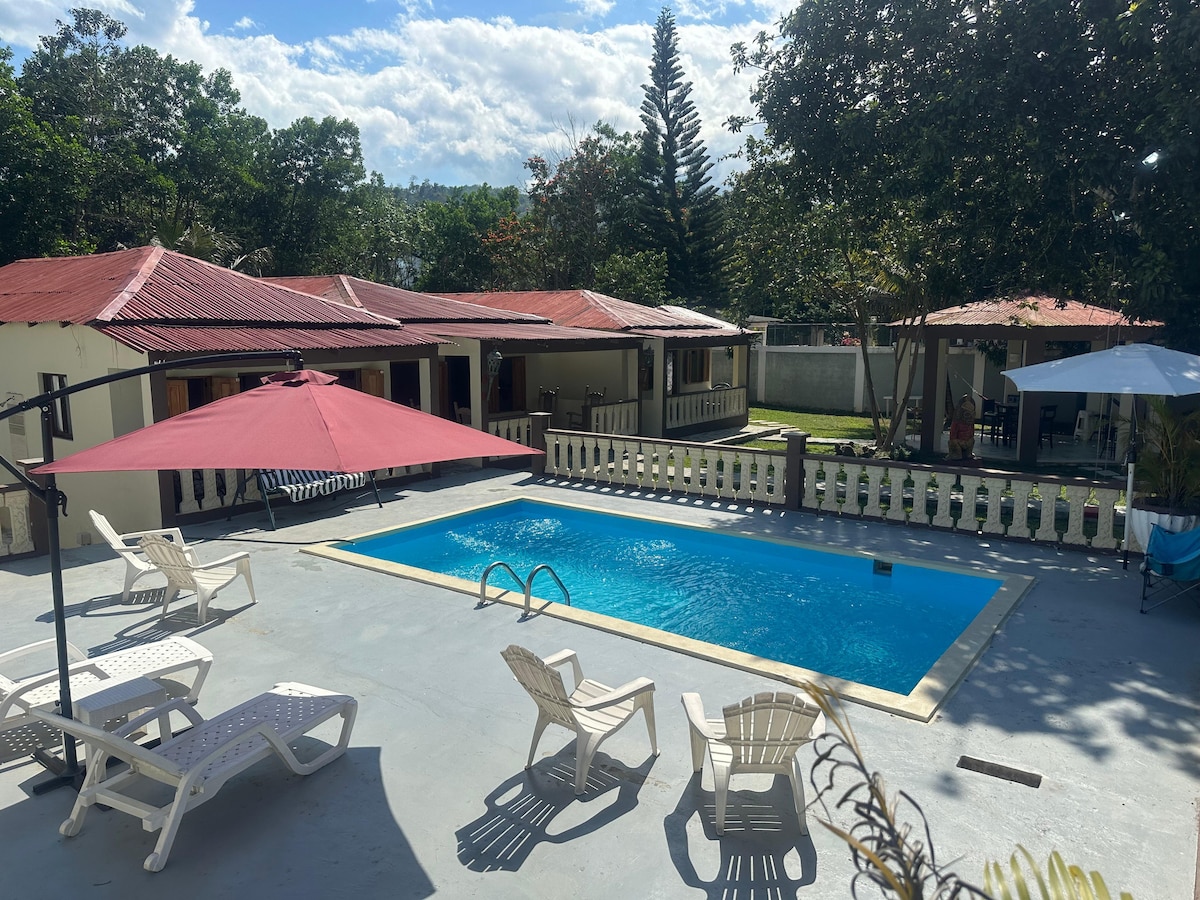 Hermosa y acogedora villa familiar al pie de las montañas de Los Mogotes, donde el cantar de las aves y el sonido del rio te llenaran de paz. Ideal para compartir con la familia y amigos. Disfruta de la excelente vista a las montañas desde la piscina, o de un bello atardecer desde el jardin. A poco tiempo de Santo Domingo, apenas 20 Min del peaje te puedes encontrar con un paraiso natural encantador.