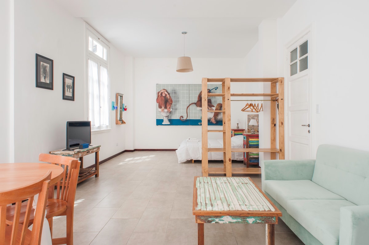 Located in Monserrat, between San Telmo and downtown Buenos Aires, this spacious studio apartment is full of light and charm. The air-conditioned living area includes a bedroom, dining table, living room (with a smart TV) and an integrated kitchen. A small terrace and a full bathroom complete the configuration. Features wi-fi connection and smart TV. Easy access to subways and buses and walking distance from most Buenos Aires attractions. The apartment is reached through one flight of stairs.
