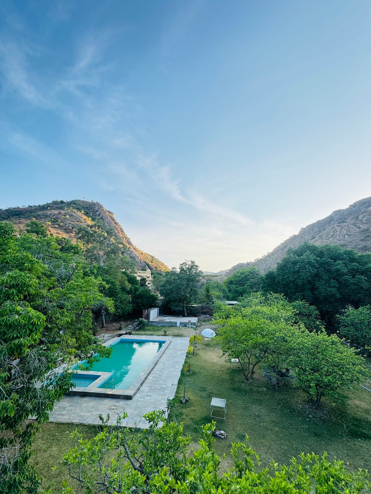Welcome to our peaceful nature villa near Udaipur, surrounded by mountains and greenery. The property features one luxury room with direct pool access and two outdoor camping tents. Guests can enjoy beautiful pool views, stunning sunset views, fresh air, and the relaxing sound of birds in a calm village-style environment. Perfect for couples, nature lovers, solo travelers, and international guests looking for a peaceful and private stay close to nature.