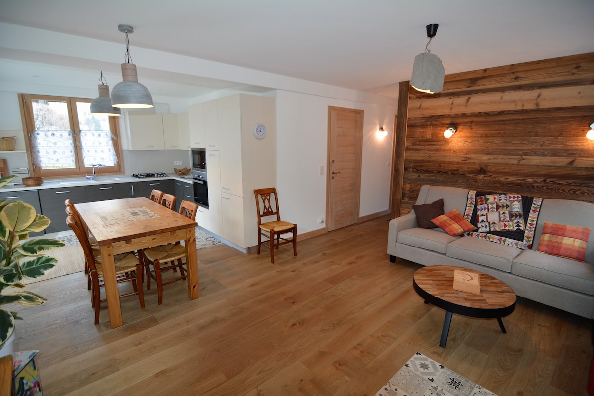 Soyez les bienvenus dans nos montagnes! Nous vous accueillons sur le coteau de Sallanches, face au Mont-Blanc, avec une vue à couper le souffle. Vous disposerez d'un appartement confortable, totalement indépendant, doté d'une chambre séparée. Vous bénéficierez également d'une terrasse privative. Nous aurons à coeur de vous guider dans le choix de vos activités et de tout faire pour que vous vous sentiez comme à la maison!