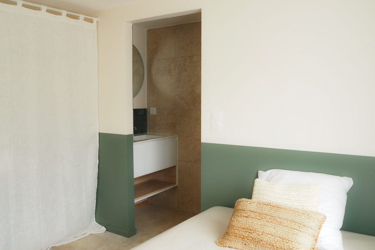Le Cocon de la Villa Ola Charmante chambre avec lit double, kitchenette équipée et salle de bain. Petit plus : terrasse privative exposée plein sud, idéale pour profiter d'un coin repas en extérieur. 📍Emplacement : • Située dans une rue calme à sens unique. • À seulement 15 minutes à pied du centre-ville de Mont-de-Marsan et du bourg de Saint-Pierre-du-Mont. • En face de l'INSPE et à proximité de l'IUT. 🚗 Pratique : parking gratuit à proximité. Un vrai cocon pour un séjour agréable !