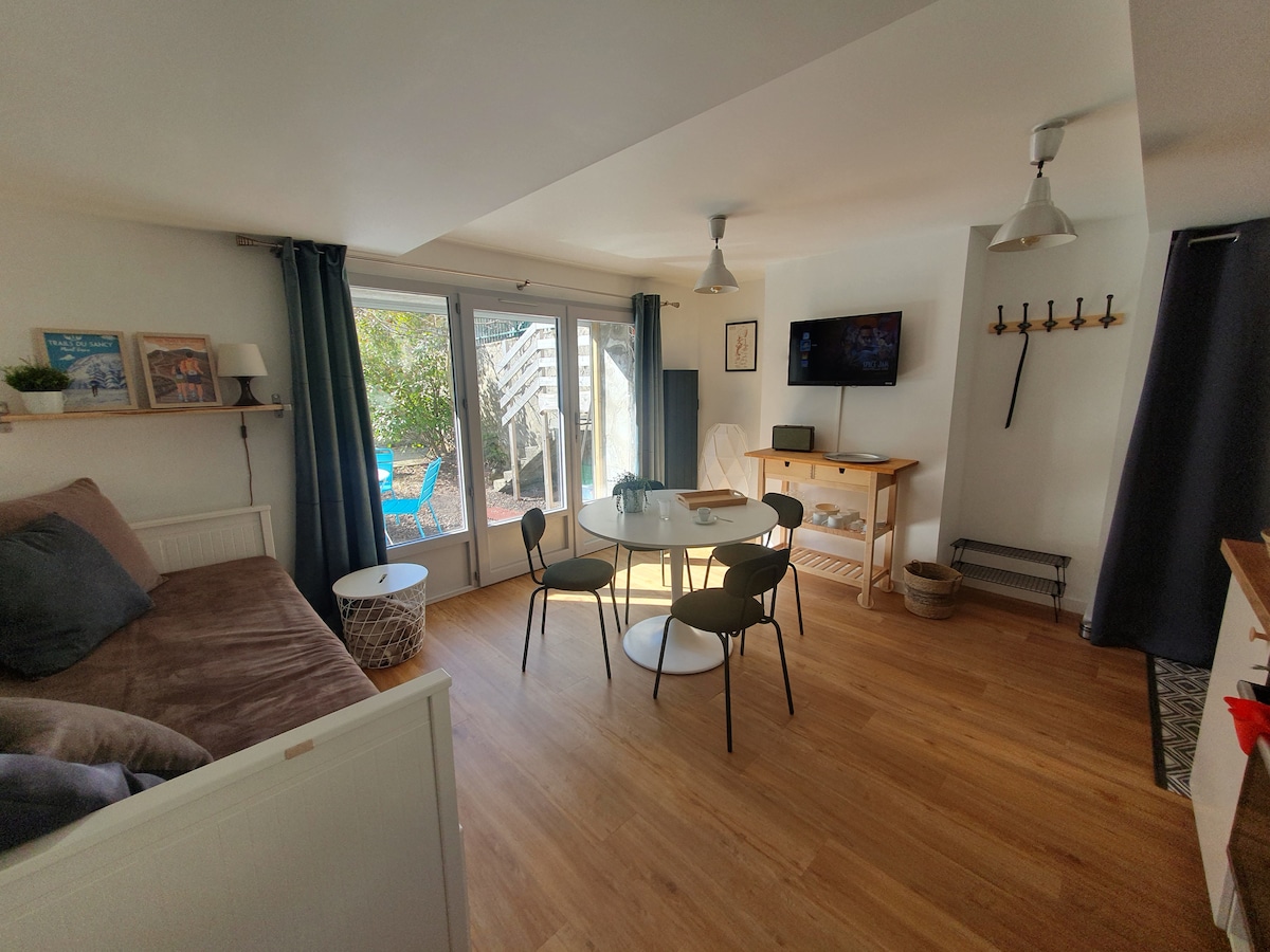 Profitez d'un logement individuel avec place de parking privée et gratuite juste devant. À 100m du départ de la grande cascade mais également à 7 min à pied du centre ville et des navettes. La cabane des Myrtilles vous propose un espace chaleureux avec une belle pièce de vie ayant un poêle à bois prêts pour une flambée, une cuisine équipée, un espace repas et un grand canapé convertible. La chambre avec un lit double et un coin bureau. Salle de bain avec douche.