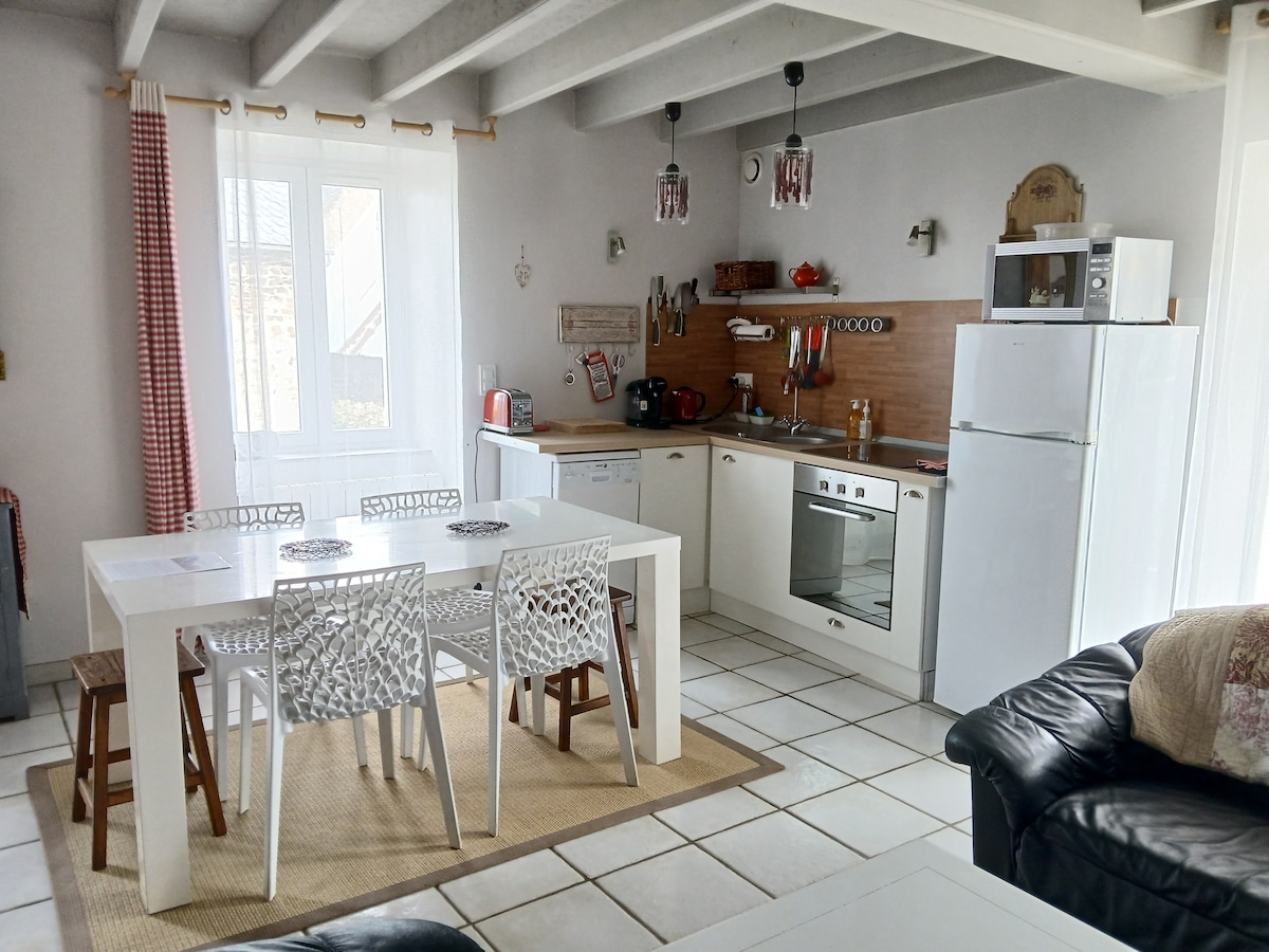 Nid douillet privé en entresol dans ancien hôtel rénové au cœur du village en desertification de Rochefort Montagne idéal pour randonnée, ski, et découverte de l'auvergne, du Sancy et de la chaine des puys. Baignoire à remous, climatisation, lit Emperor (2x2m), Matelas EMMA sur lattes, cuisine toute équipée avec lave vaisselle, four, four micro ondes, batterie d'ustensiles, fondue, crêpe, raclette, feux gaz et plaques induction, réfrigérateur SMEG, lave linge, sèche linge, TV LG