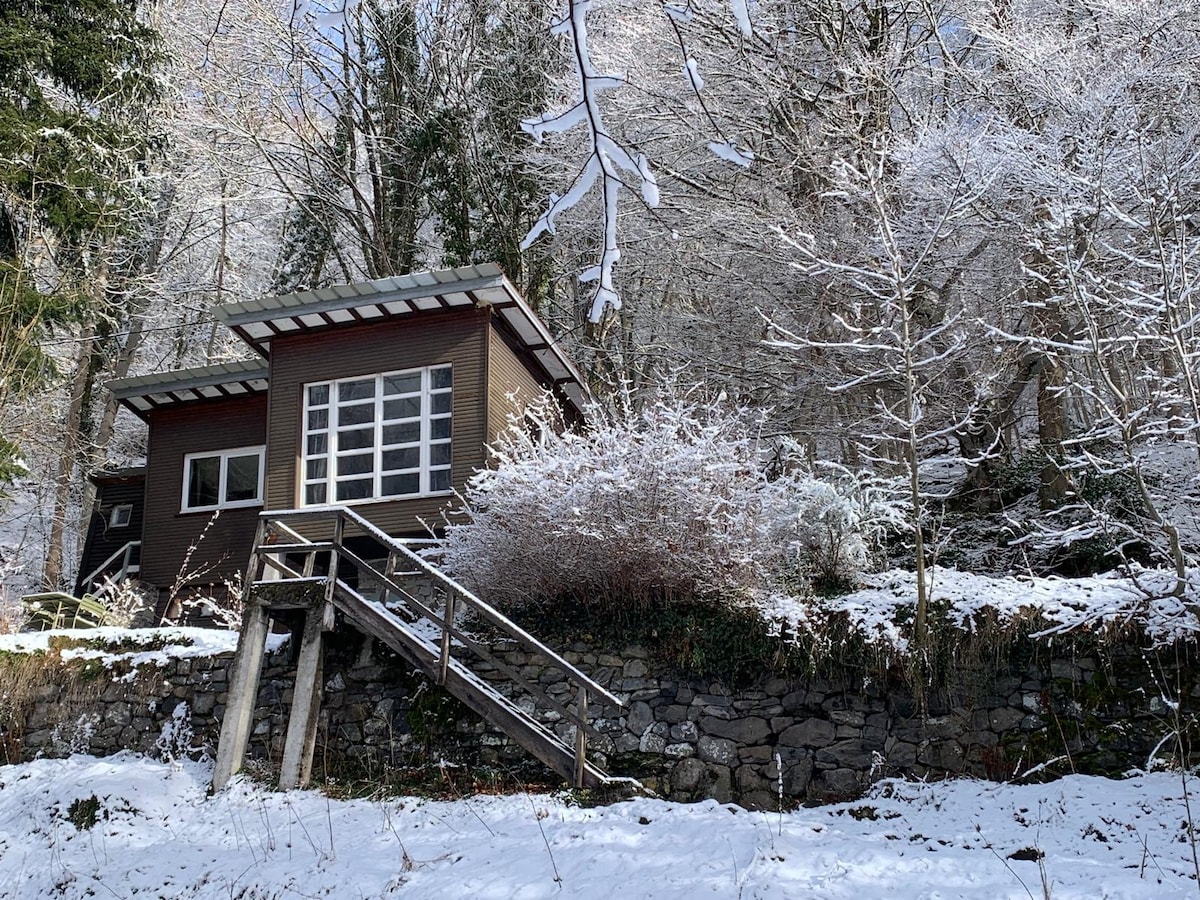 Profitez d'un logement individuel avec place de parking privée et gratuite juste devant. À 100m du départ de la grande cascade mais également à 7 min à pied du centre ville et des navettes. La cabane des Myrtilles vous propose un espace chaleureux avec une belle pièce de vie ayant un poêle à bois prêts pour une flambée, une cuisine équipée, un espace repas et un grand canapé convertible. La chambre avec un lit double et un coin bureau. Salle de bain avec douche.