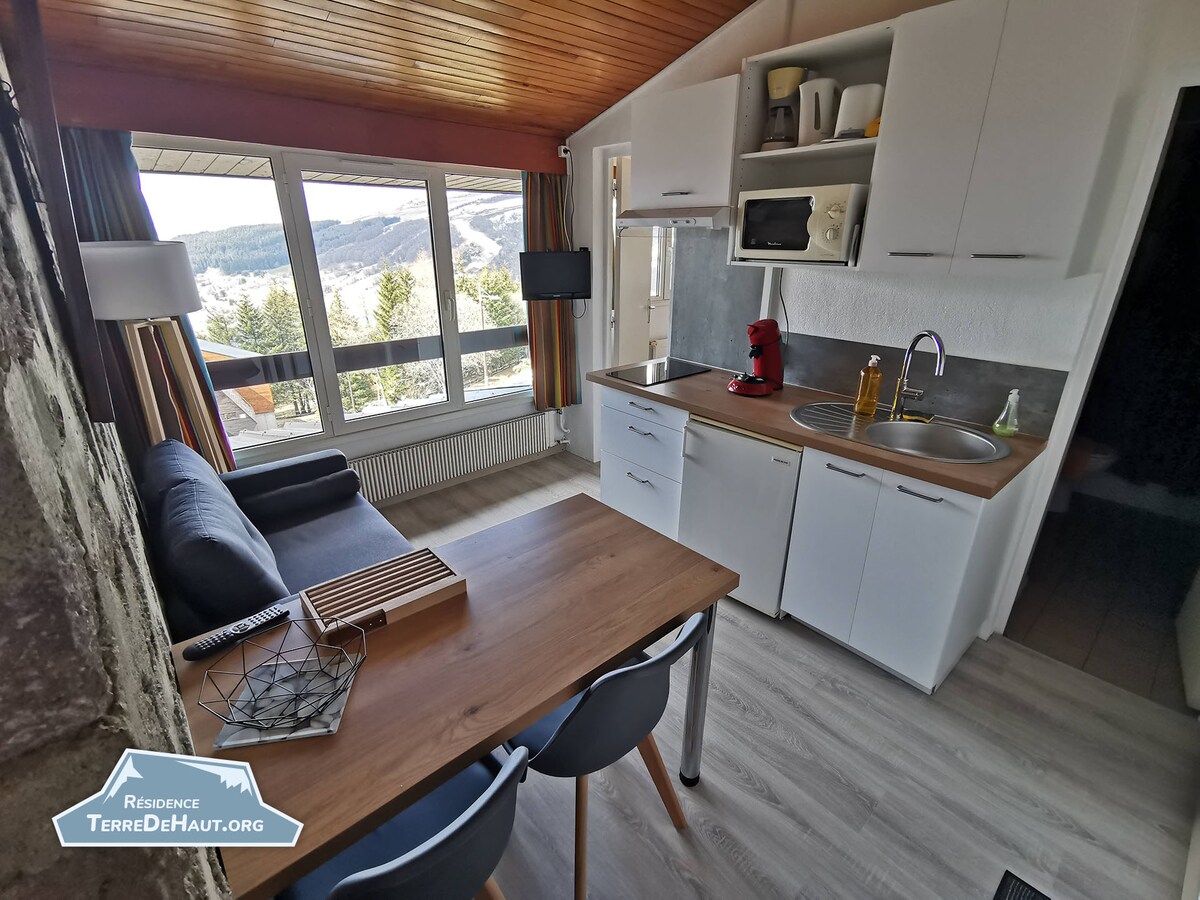 Magnifique petit chalet de 1968, à flanc de montagne au sein d'1 ensemble d'une quarantaine de chalets nichés au milieu de la végétation en zone espace naturel protégé à 1200m d'altitude. Pour les amoureux de la nature, 2km de station de ski et Mont-Dore, vue imprenable sur le Massif du Sancy/Capucin (large baie coulissante sur terrasse). Rénové en 2019 cuisine intégrée, salon avec cheminée à foyer fermé. En auto-gestion, ménage à faire au départ sinon à réserver à la conciergerie. 5 pers maxi.