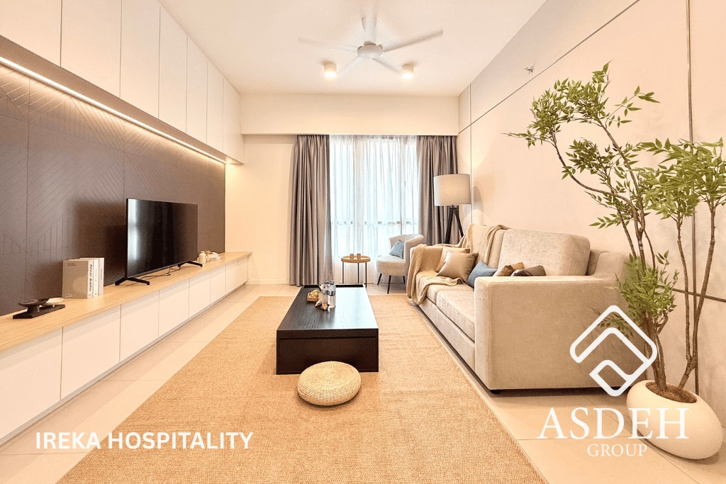 🏢 Mont Kiara Arocris Premium 1-Bedroom Corner Unit with Balcony Experience elegant Classic Concept Design and decor in this beautiful corner 1-bedroom apartment situated on Mont Kiara’s main street. Equipped with a King-sized bed, single bed, and sofa bed, it’s perfect for families or groups seeking comfort, style, and convenience.