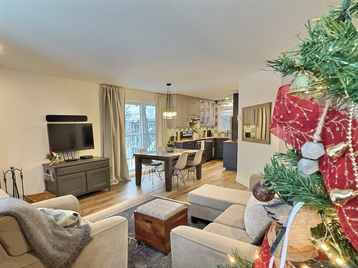 Profitez de votre séjour dans un magnifique condo avec vue sur les pentes de ski. Le condo est situé à 5 minutes à pied de la montagne de ski. Le condo inclus; 1 chambre avec lit queen, 1 chambre avec lit double, 1 divan lit, 1 salle de bain incluant une douche, laveuse et sécheuse, un poêle à bois avec bois ansi qu’une air climatisé , 2 espaces de stationnements et le Wifi rapide. Activités à proximités : Ski alpin, Golf, Vélo de montagne (Empire 47) et le Parc National de la Jacques Cartier.