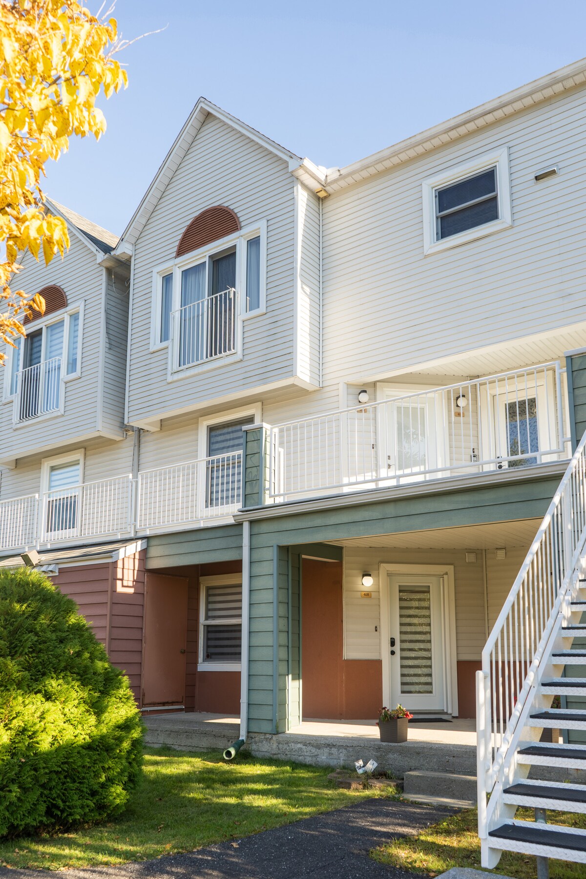 Maison jumelée qui se situe sur une rue semi-privée sans issue dans un quartier avec beaucoup d'arbres et des rues tranquilles. Près de la rue Maple, il est situé à 5 minutes en voiture du Mont Sutton et à 2 minutes du village. À proximité des circuits touristiques de la région : vélo, randonnée, ski, vignobles, restaurants, boutiques, etc. Gros chien très cool sur place