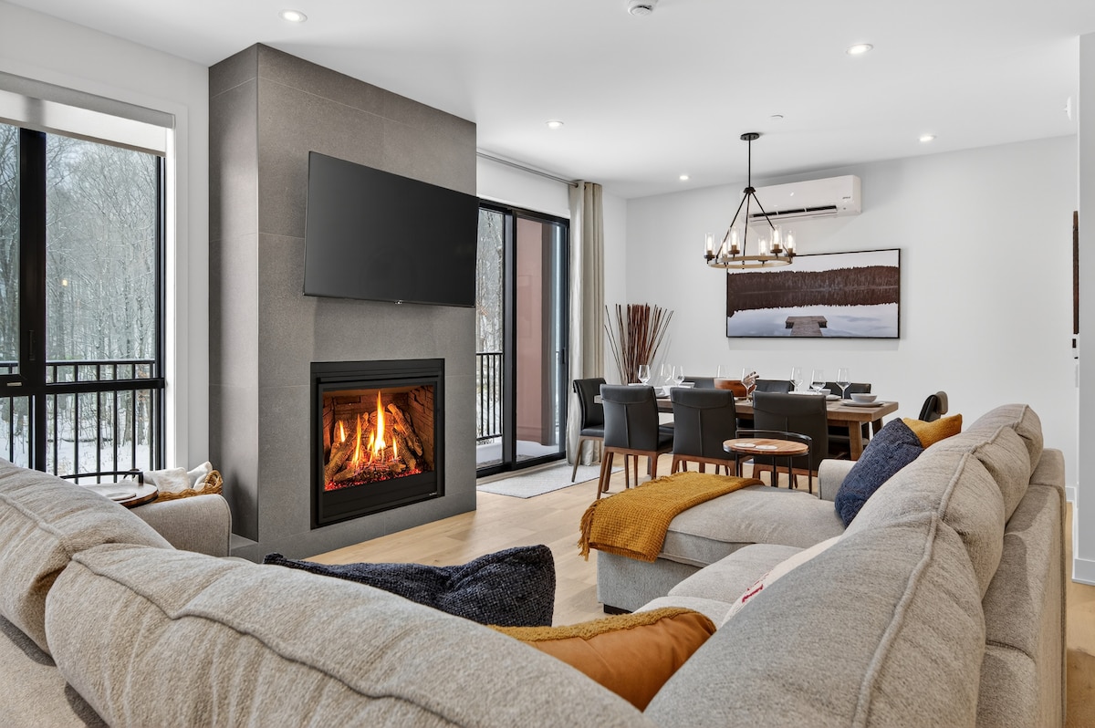 Escape to Altitude 170-1, a luxurious 2-bedroom, 2-bathroom condo that sleeps 6, offering the ultimate ski-in/ski-out experience at Mont-Tremblant Resort. Enjoy breathtaking mountain and lake views from the expansive terrace, complete with a private hot tub and outdoor gas fireplace. This corner unit boasts a spacious living area with a wood fireplace and a fully equipped kitchen. Steps from shops, dining, and slopes, Altitude 170-1 is your perfect blend of comfort, luxury, and convenience!