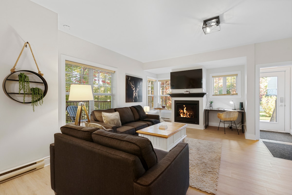 Escape to Altitude 170-1, a luxurious 2-bedroom, 2-bathroom condo that sleeps 6, offering the ultimate ski-in/ski-out experience at Mont-Tremblant Resort. Enjoy breathtaking mountain and lake views from the expansive terrace, complete with a private hot tub and outdoor gas fireplace. This corner unit boasts a spacious living area with a wood fireplace and a fully equipped kitchen. Steps from shops, dining, and slopes, Altitude 170-1 is your perfect blend of comfort, luxury, and convenience!