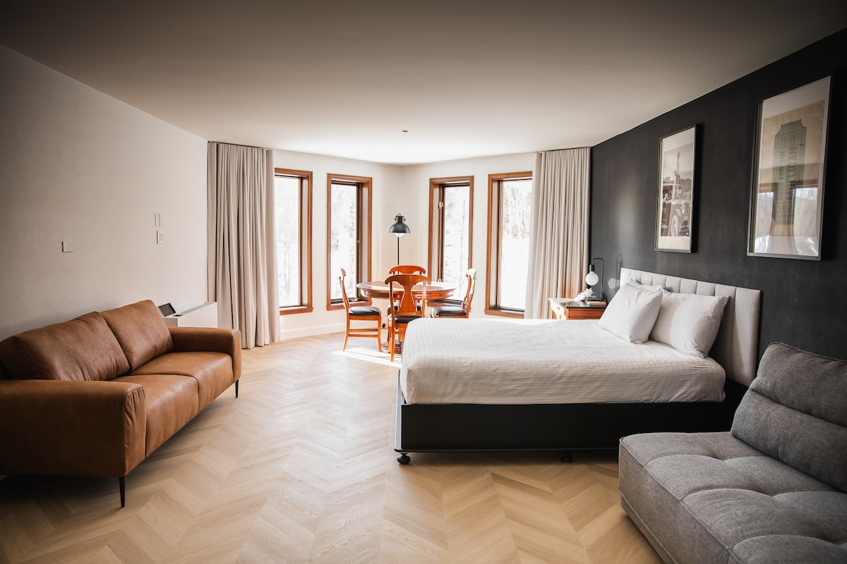 Go for a romantic weekend or get away with your family to a superb, air-conditioned luxurious suite situated on the second floor of hotel st-sauveur. Take the elevator to a romantic room with a gas fireplace, terrace, wifi, espresso bar, and a fully functional kitchen. You will be in the heart of St-sauveur with many attractions. Take a stroll on Principal Street. You will be minutes away from the ski slopes, montain biking, restaurants, and lots of shopping.