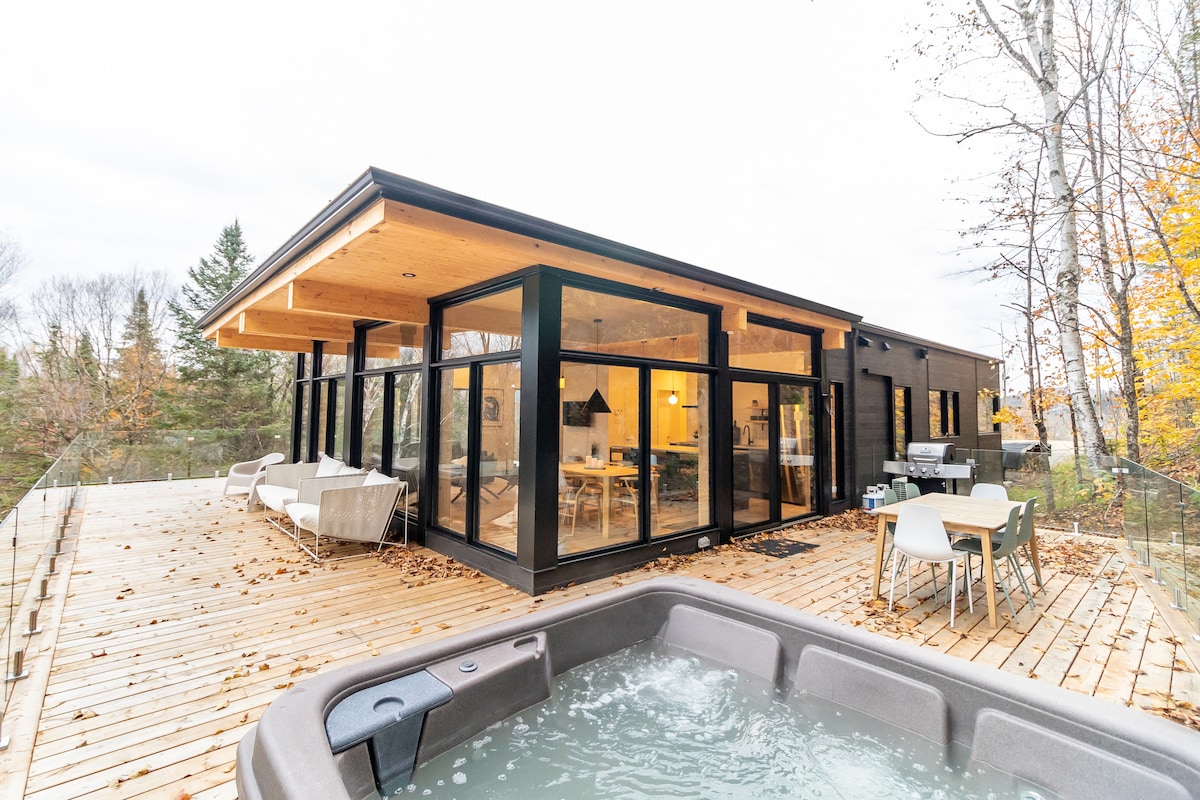 Contact us for our On-going Promotion! Unique & Secluded Architect Glass Cabin in the Treetops of Tremblant! The Sköv (Forest in Danish) is the unique design of the glass blends into the landscape so you can retreat to comfort and luxury. It is a majestically glazed architectural space combining natural simplicity & contemporary luxury, 10 min from village Mont-Tremblant & Panoramic terrace & Private Hot tub In Laurentian. Designed by Canadian famous Designer in shared domain of 1200 Acres!