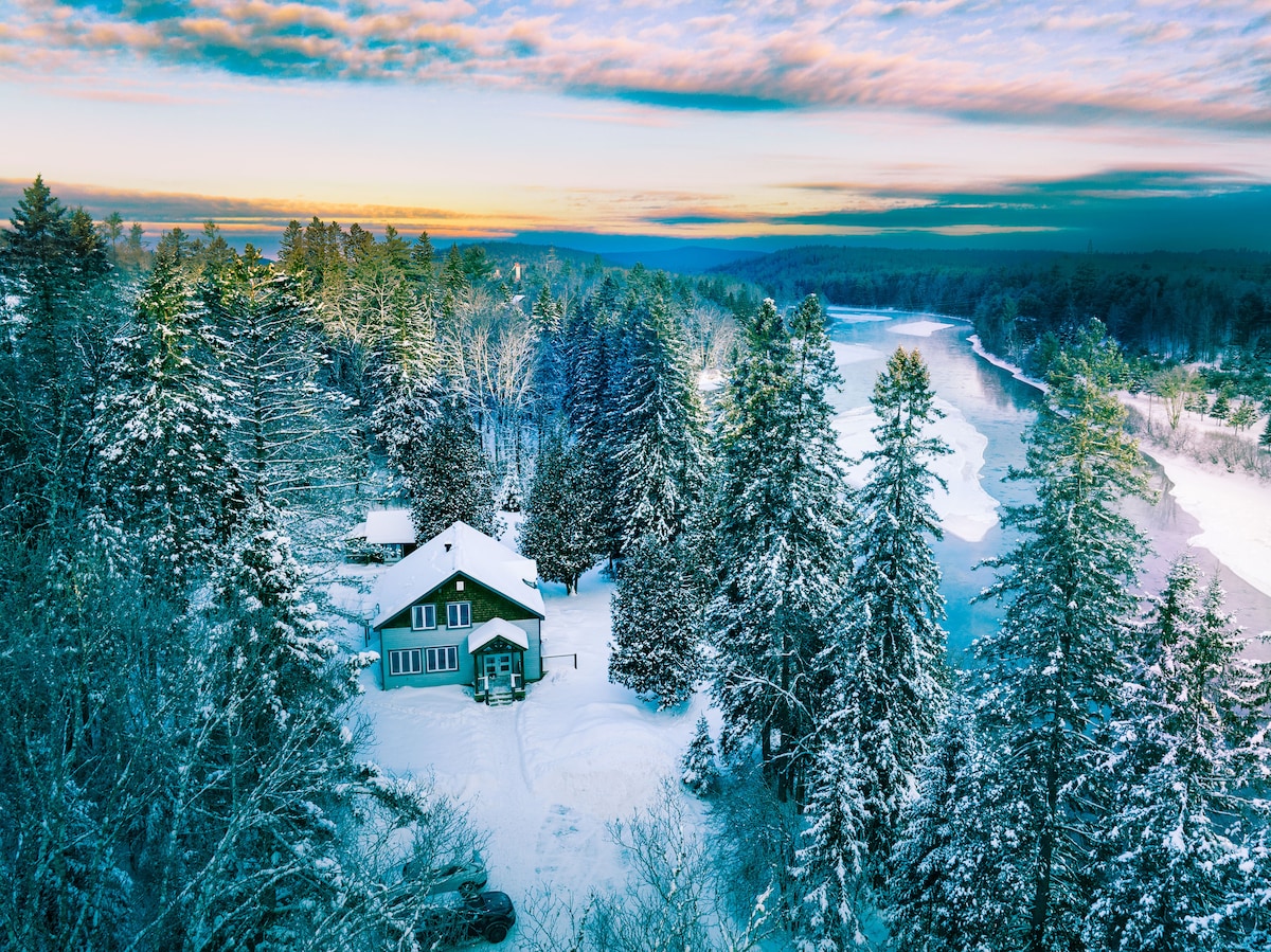 Escape to a spacious, cozy chalet on the banks of the Rouge River, just 25 minutes from Mont-Tremblant. Perfect for families and groups, it features a covered spa, a 3-season screened veranda, an EV charger, a full game room, a chef’s kitchen featuring Nespresso and Keurig machines, and high-speed Wi-Fi. Enjoy easy access to skiing, hiking, kayaking, and year-round outdoor adventures. The ideal retreat to relax, recharge, and enjoy nature in every season.