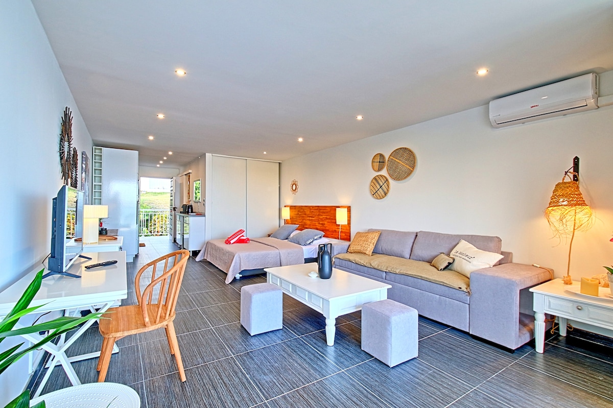 Ce studio rénové en 2024, situé en bord de mer à Saint-Martin, offre une vue panoramique directement sur la Baie Orientale sans bâtiment en avant. * Profitez de la plage à quelques pas, * Accès à la grande piscine privée * Balcon privé * Air conditionné, grand lit king, sofa-lit * Wi-Fi 1 Gb/s, * TV 4K * Intérieur moderne comprend une grande cuisine complète avec four (électros Bosch) * Machine à laver et plus Profitez de la mer, du soleil et de la tranquillité dans ce cadre idyllique!
