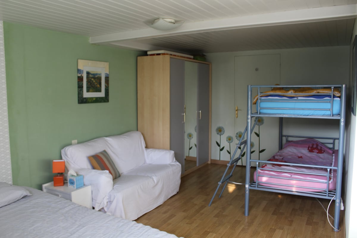 Venez profiter d’un studio de 25 m2 confortable et entièrement rénové à moins d’un quart d’heure du Puy du Fou. Nous pouvons accueillir deux adultes dans un grand lit et jusqu’à deux enfants grâce au canapé convertible en lit. Vous disposerez d’une cuisine équipée d’un frigo, de plaques, d’une bouilloire et d’une machine à café. Évidemment, chaque matin, nous aurons le plaisir de vous offrir le petit déjeuner.