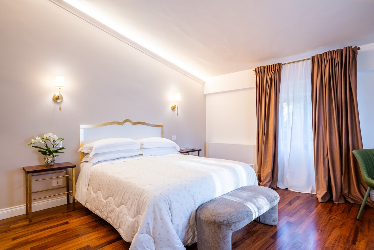 Immerse yourself in refined comfort in our elegant room at San Prospero Heritage. Enjoy a spacious, light-filled room with a king-size bed, designer furnishings, and a luxurious travertine bathroom. Stay connected with fast Wi-Fi, relax with Netflix on a smart TV, and enjoy seamless self check-in. Located in a charming Liberty-style building, just a scenic walk from Siena’s historic center.