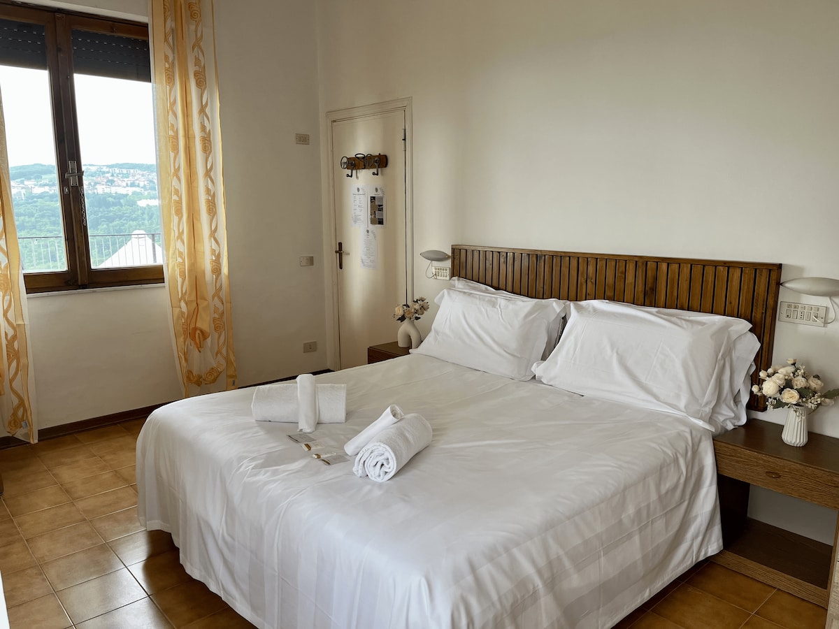 Stanza matrimoniale con elementi di arredo unici, perfetta per visitare il piccolo borgo di Pienza, costruita come città ideale. Sarà a vostra disposizione un minibar, televisione e un bagno privato. Lato strada.