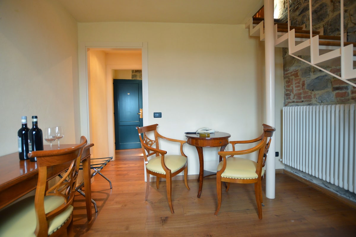 Wake up enjoying the slow village life. Staying in a deluxe double room with a king-size bed. Furnished with modern design but keeping intact the characteristics of the context. Parquet, air conditioning, WiFi, satellite TV, private bathroom, electronic lock, safe, refrigerator.