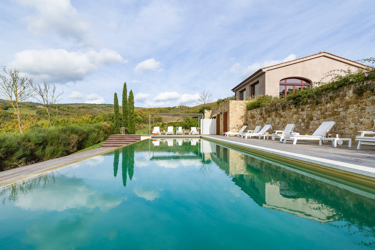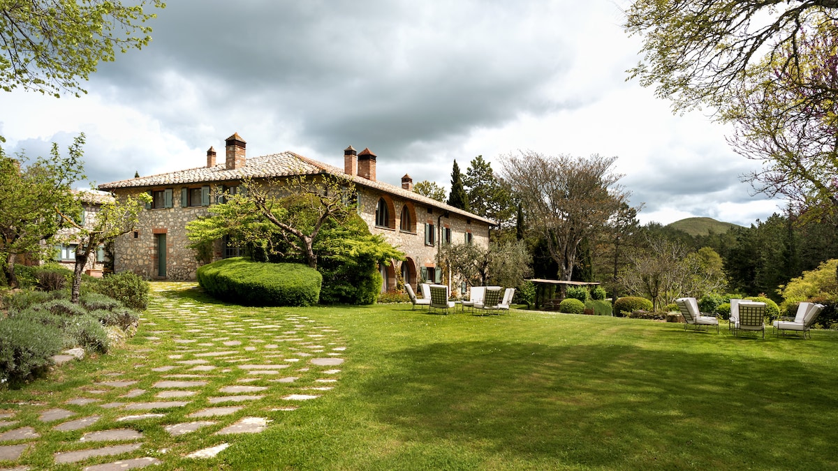 Handcrafted furniture and a modern eye for color breathe new life into this 16th-century former convent set between Tuscany’s Val di Chiana and Val d’Orcia. Olive groves and a lawn surround the outdoor pool and for-the-picking vegetable garden, and inside there’s a second pool and a games room. It’s 20 kilometers to Renaissance architecture in Pienza and hot springs in San Casciano dei Bagni.