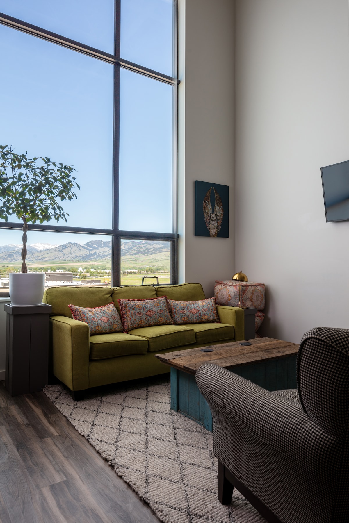 This 2 bedroom, 2 bathroom condo features 180-degree views of the Bridger Mountains. The oversized north-facing window baths the room in natural light. It has a full kitchen, living area, 1 king bed, 1 bunk bed, 2 full baths, walk in closet, and laundry. Outdoor roof top entertaining space for guests. The condo is upstairs from Ponderosa social club, Ceremony salon and spa, and Bourbon BBQ. Walking distance from lots of local favorites including Freefall Brewery, The Elm, and Access Fitness.