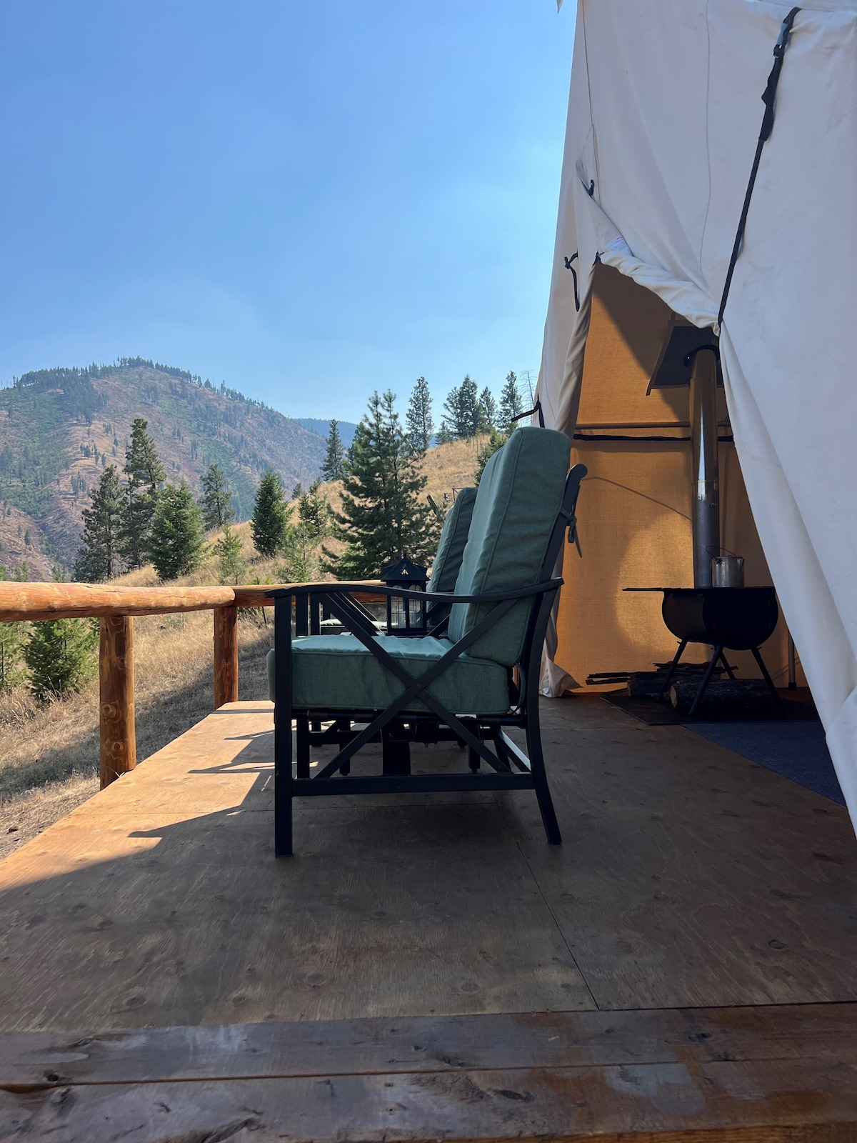 Welcome to our Mountain Treehouse Tent! 16x20 wall tent on raised platform with large deck with lake and forest views. Relax in the cedar sauna complete with cold plunge and outdoor (warm!) shower. Fresh mountain glacial spring water. Brand new outhouse 2025! Wood stove inside the tent for chilly evenings. Hike up to the top of the mountain for spectacular Flathead Lake views. Starry nights and wildlife galore. Please note I have additional listing on the same property if you need two tents⛺️🏕