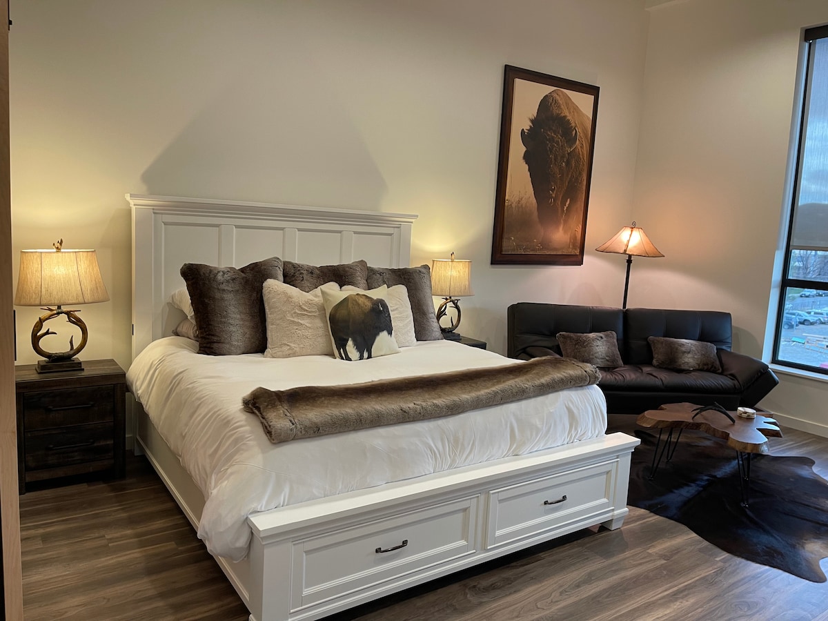 This 2 bedroom, 2 bathroom condo features 180-degree views of the Bridger Mountains. The oversized north-facing window baths the room in natural light. It has a full kitchen, living area, 1 king bed, 1 bunk bed, 2 full baths, walk in closet, and laundry. Outdoor roof top entertaining space for guests. The condo is upstairs from Ponderosa social club, Ceremony salon and spa, and Bourbon BBQ. Walking distance from lots of local favorites including Freefall Brewery, The Elm, and Access Fitness.