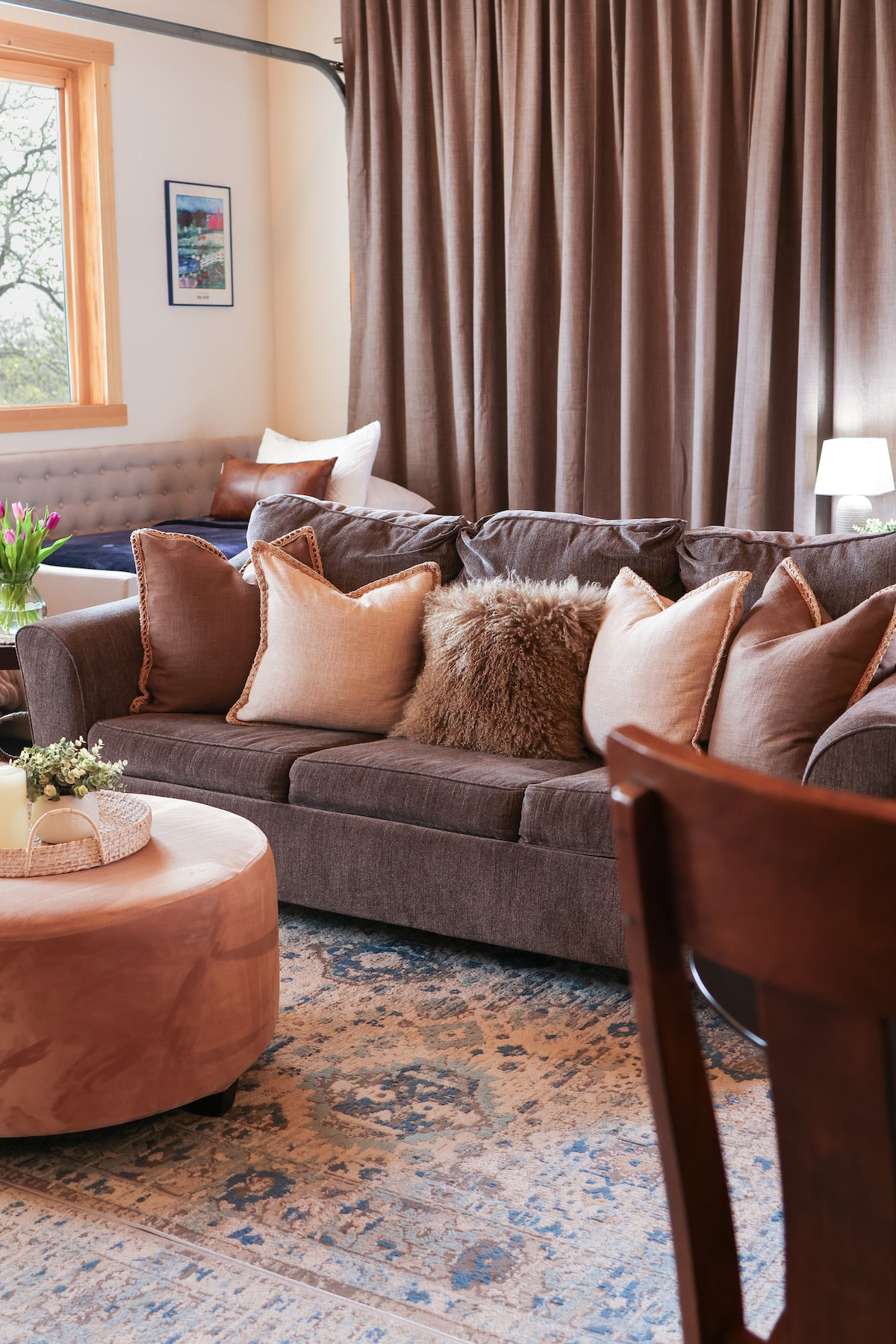 Retreat to the fire pit of your opulent healing farm cabin with your own giant round hobbit window facing sunset & gaze at the twinkling night sky, majestic views or play with the goats. Only 7 min from town, come rest, play and heal in your private cabin with all the comforts of a clawfoot tub, walk-in rain shower, full kitchen with Italian farm sink, high-speed wifi, large flatscreen smart tv, king size bed, twin pull out couch and art from your hosts.