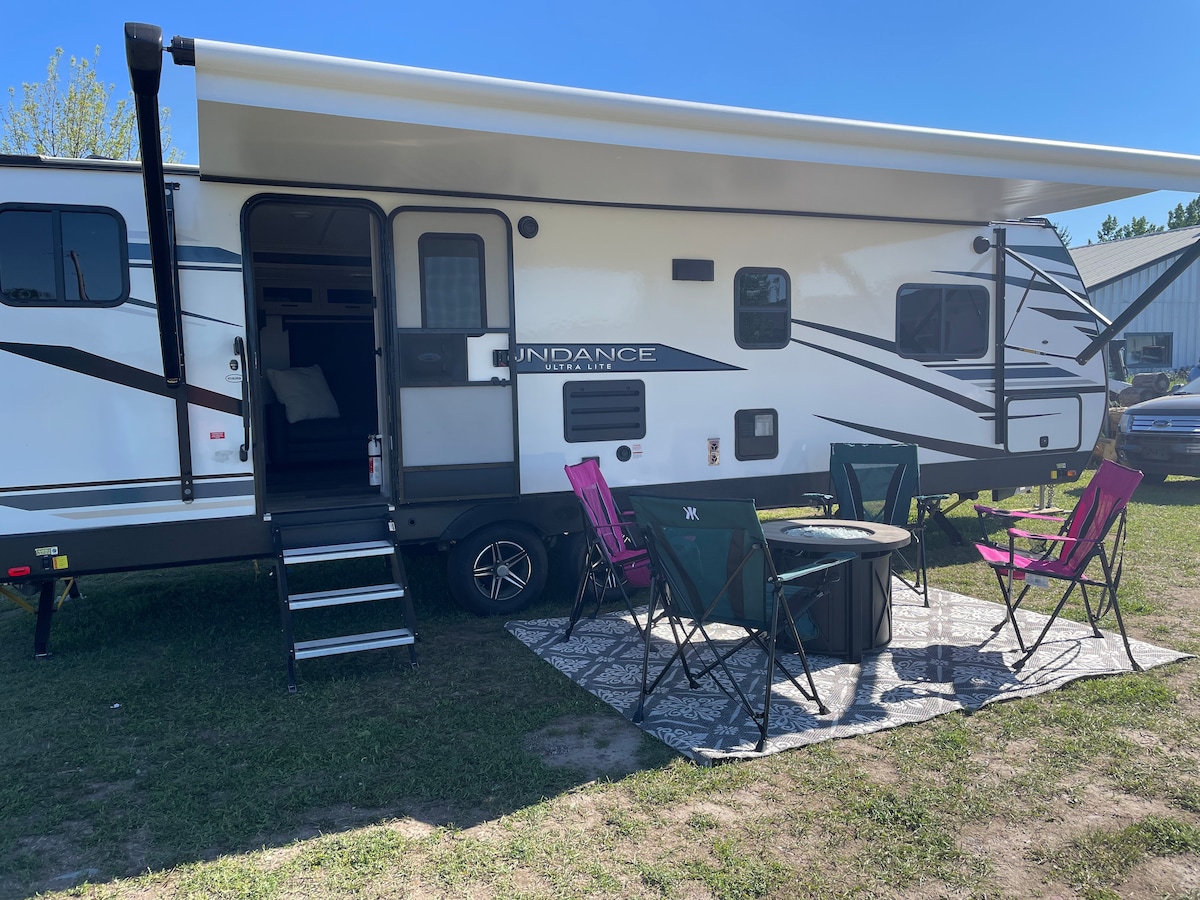 Gateway to Glacier National Park; just 10 miles east on Hwy 2. Very comfortable 2019, 5th wheel, air conditioning and heat. One bedroom, king bed, couch opens into a queen bed. Fire place, flat screen TV, and WiFi available. Kitchen and cooking available. Private yard, camp fire, tent space available (your tent and your bedding), quiet neighborhood. We are located right off Hwy 2, so there is some highway noise. Enjoy a comfortable camping experience in beautiful, north west Montana.